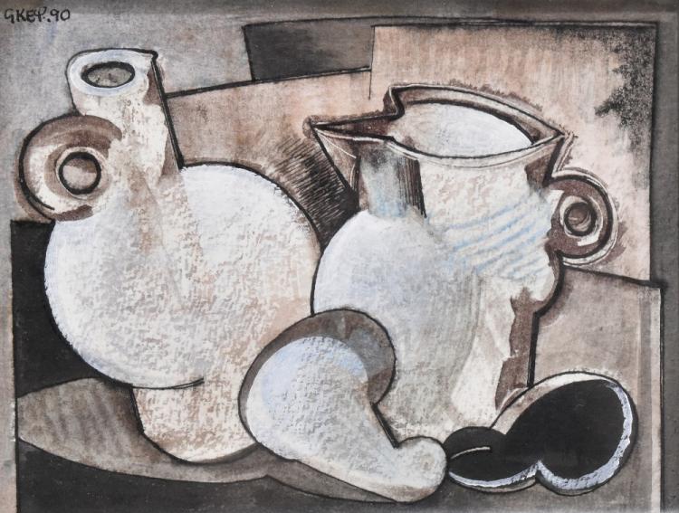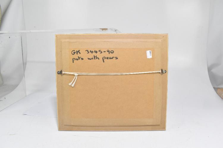 Lot 94 of 2039: GEOFFREY KEY (born 1941); mixed media, 'Pots with Pears', signed and dated 90 top left, 12 x 17cm, inscribed GK 3445-90 to the reverse, framed and glazed. (D)