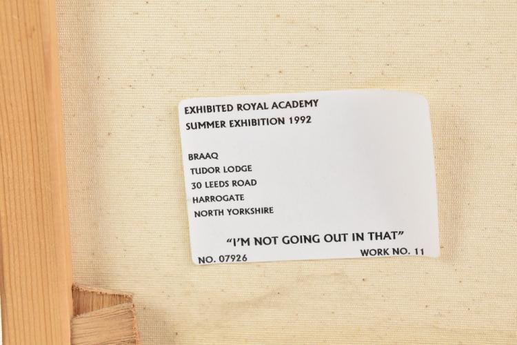 Lot 167 of 2039: BRIAN SHIELDS (BRAAQ) (1951-1997); oil on canvas, 'I'm Not Going Out in That', signed, further inscribed 'Ann' and bearing label verso 'Exhibited Royal Academy Summer Exhibition 1992, No.07926, Work No.11', 46 x 61cm, framed. (D) Provenance: Private collection, London.