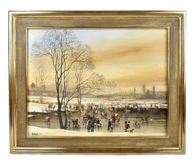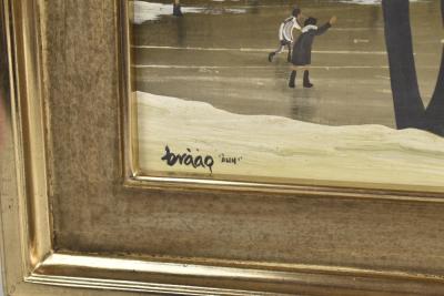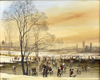 Lot 170 of 2039: BRIAN SHIELDS (BRAAQ) (1951-1997); oil on board, expansive industrial landscape with figures on frozen lake in foreground, signed, further inscribed 'Ann', 39 x 49cm, framed. (D) Provenance: Private collection, London.
