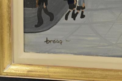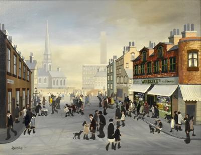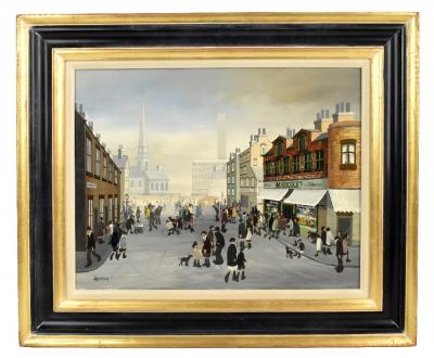 Lot 171 of 2039: BRIAN SHIELDS (BRAAQ) (1951-1997); oil on canvas, 'Kinder St, Woodcock's Canopied Fruit and Flower Shop', signed, further inscribed 'Ann' and also inscribed verso 'Braaq 21/3/80 Painted for Royal Academy', 35 x 45.5cm, framed. (D) Provenance: Private collection, London.