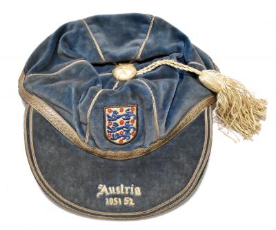 Lot 525 of 2039: TOM FINNEY; the rare England cap from the 'Lion of Vienna' football match between Austria and England played 25th May 1952, with England three lions crest, bullion detail, tassel and embroidered 'Austria 1951 52'; Tom Finney played alongside 'The Lion' Nat Lofthouse in the famous 2-3 away victory in which Lofthouse scored twice, assisted by Finney for the goal during which he was knocked unconscious by an Austrian defender. Tom Finney CBE was a true one-club man, making 569 first-class appearan