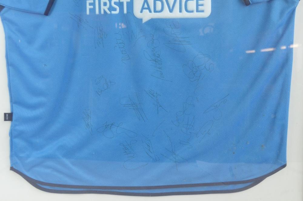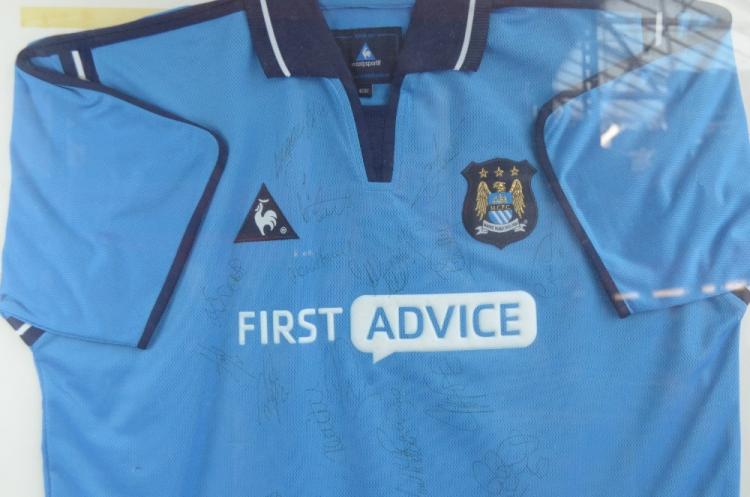 Lot 529 of 2039: MANCHESTER CITY; a framed autographed Le Coq Sportif 2002-2003 home shirt, bearing various signatures, with certificate of authenticity from Spiritofsport.co.uk, framed and glazed.