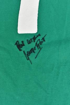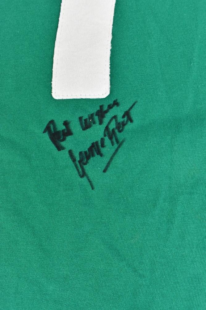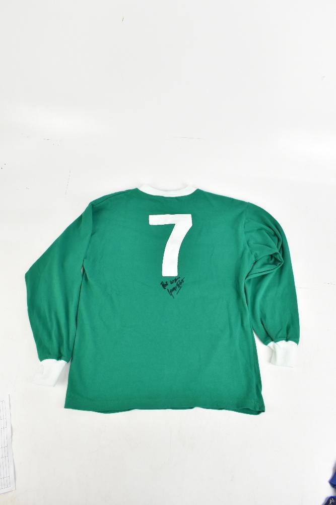 Lot 537 of 2039: GEORGE BEST; a Toffs Northern Ireland retro-style cotton long-sleeved shirt signed and inscribed ‘Best Wishes’ with no. 7 to reverse, size S.