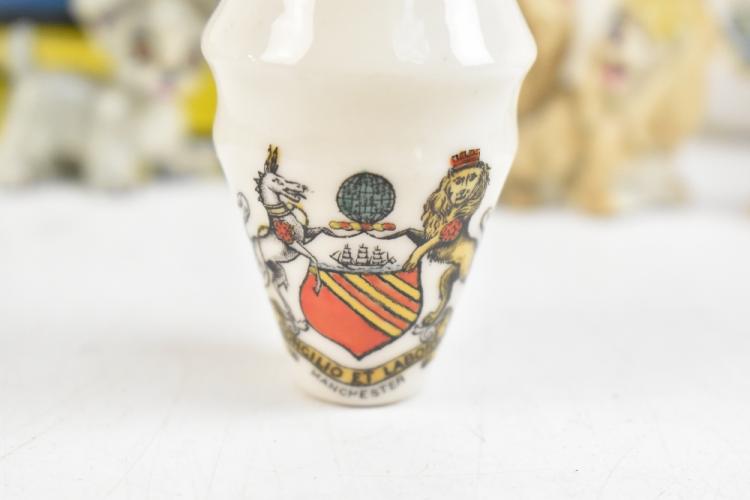 Lot 1102 of 2039: A brass fishing reel with turned ivory handle, unnamed, together with a small turned wood and brass sea reel, five Osram Christmas light boxes and contents, the vintage lights sold as decorative items only, The Victory jigsaw puzzle, a cocktail shaker, a small selection of crested china, a selection of Wade model animals including some Disney characters, and various model toys (qty).