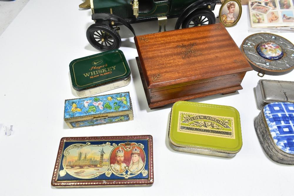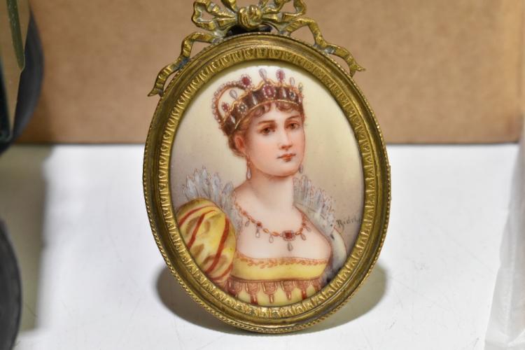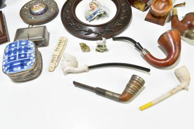 Lot 1103 of 2039: A collection of decorative items to include a late 19th century French miniature portrait plaque of a princess signed Bidel, a Royal Doulton plaque of Queen Victoria in a carved oak frame, diameter 20.5cm, a silver mounted tobacco pipe, a brass dressing table mirror, a pewter mounted circular disk with enamel centre, a modern model of an EB West TV Rental vehicle, a photograph album decorated internally with flowers, a 1930’s carved Ivory paper knife, chip to the handle, a large collection of pl