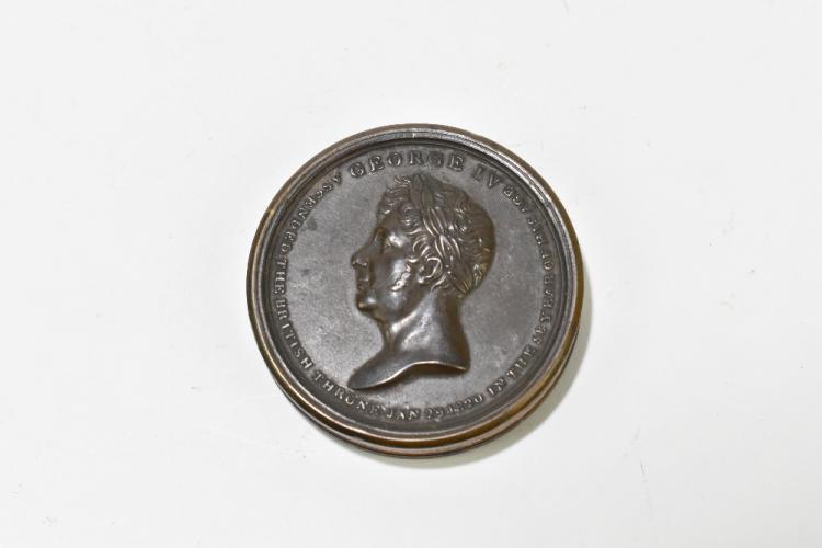 Lot 1106 of 2039: A George IV 1821 Coronation copper box medal bearing bust in relief to obverse and inscribed 'Chronology of the Sovereigns of England', to reverse, housing fourteen double sided card discs.