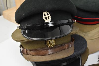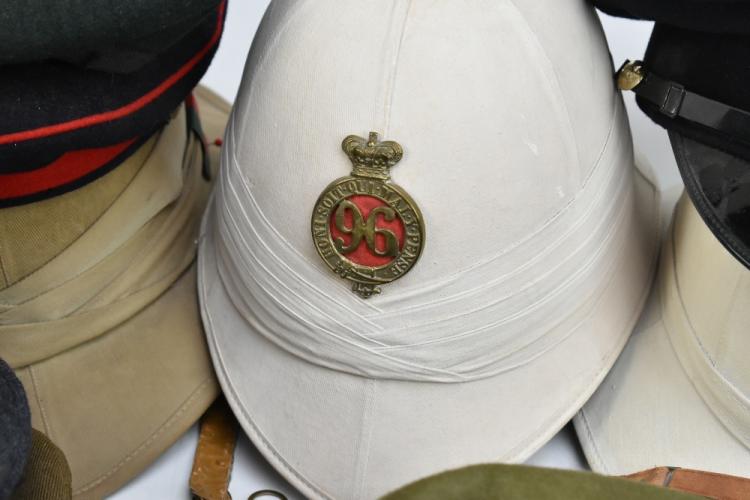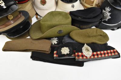 Lot 1411 of 2039: A collection of military hats and helmets, including beret with gilt bullion badge for the Queen's Regiment, a beret with applied badge for the Black Watch, caps with RAF and further badges, two Scottish berets, one with applied Argyll and Sutherland badge, a Manchester City Police cap, a Lancashire Constabulary police helmet, two tropical type helmets, one with applied badge for the 96th regiment, a naval cap with H.M.S Hermes Tally, a 1980s NATO combat helmet with desert camouflage, etc.