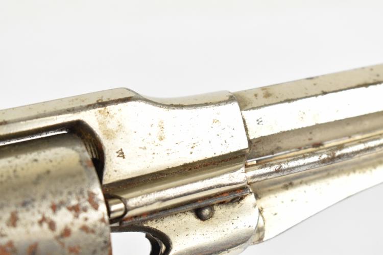 Lot 1487 of 2039: A Remington New Army model nickel plated revolver converted to .44 rimfire, with a six shot cylinder and 8" octagonal barrel, the top flat stamped Patented September 14 1856, further stamped E. Remington & Sons, Illion. New York, US above New Model, and mounted with walnut grips, overall length 37cm.