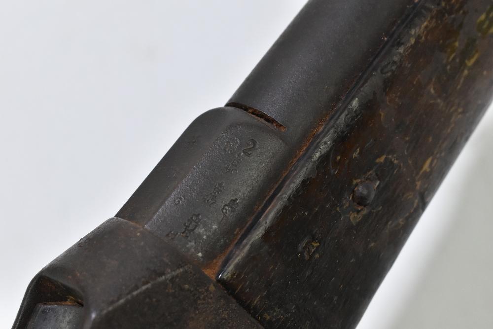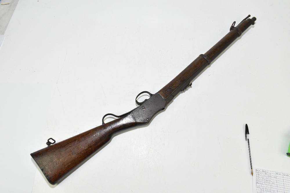 Lot 1528 of 2039: A Enfield .450/.577 Martini-Henry action two band carbine rifle with 21" barrel, the action stamped 'Enfield 1885' below V.R crown cipher and II. and further stamped '2', with various broad arrow and double broad arrow throughout the barrel, the action and woodwork and further stamped to the stock 'Birmingham.99', and bearing a brass inlaid plaque stamped 'R.I.C' above 3604 and fitted with sling straps (af).