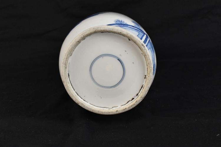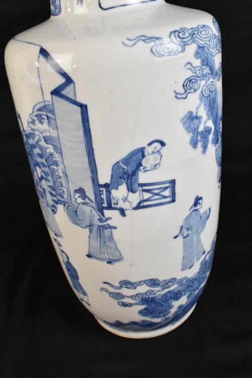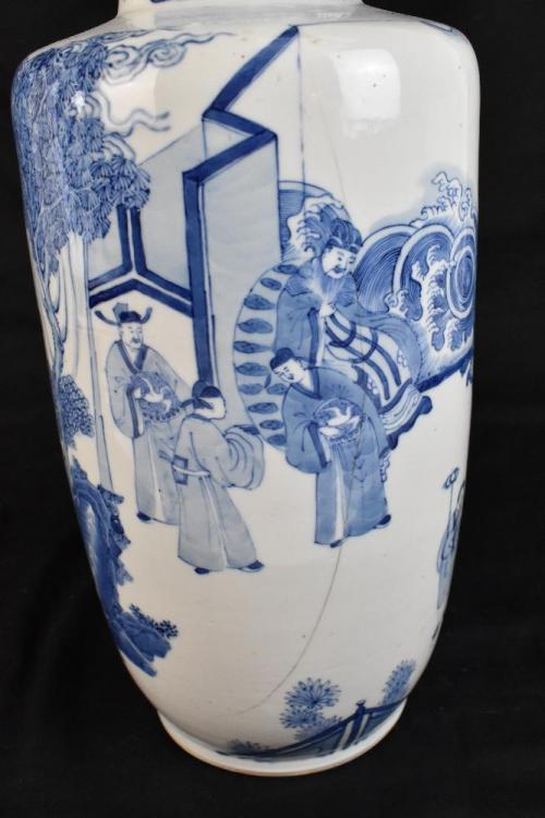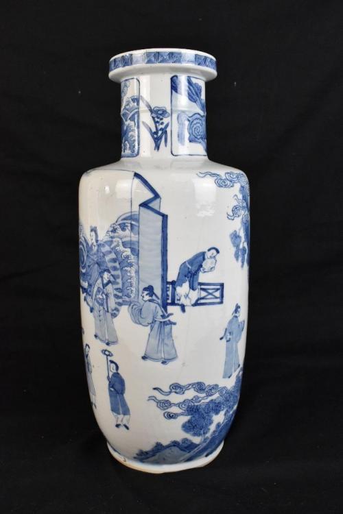 Lot 1 of 1739: A good and large 19th century Chinese blue and white rouleau vase, painted with a continuous figural landscape, painted double ring mark to base, height 44.5cm. The vase has been in the family since the 1950s. It was given to the vendor's aunt by Mrs Lloyd of Lloyd Shipping as they were friends through the Christian Science Church in Wallasey. Mrs Lloyd was a wealthy widow who lived in New Brighton and was part of the large shipping firm established in the late 19th century.