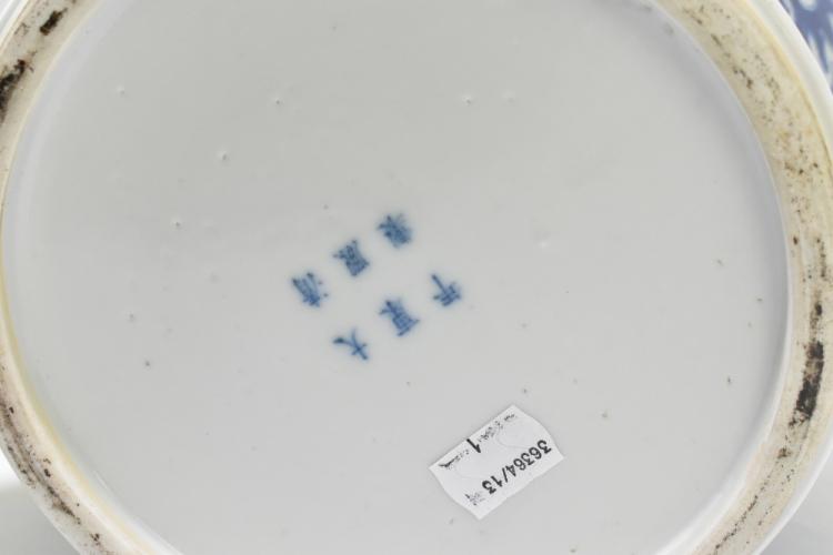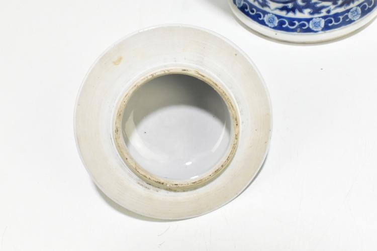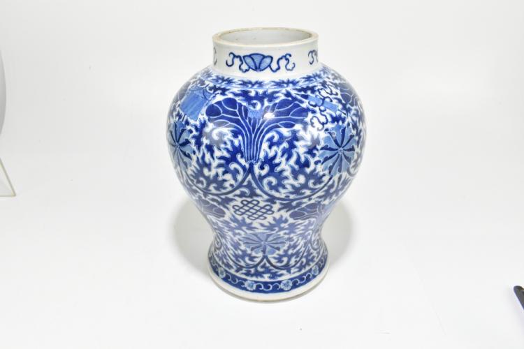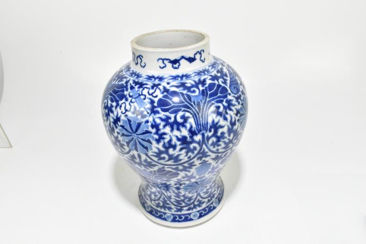 Lot 3 of 1739: A late 19th century Chinese blue and white porcelain temple jar and cover, the top rim painted with Mandarin motifs above a body profusely decorated with lotus flowers and floral sprays, bearing six character mark to the underside, height 43cm.