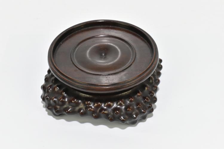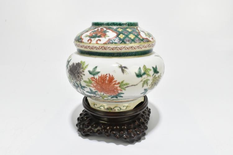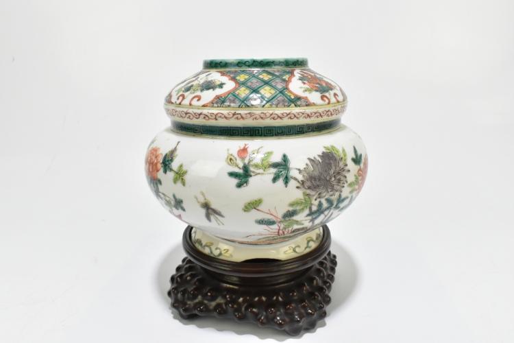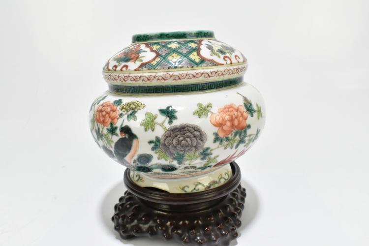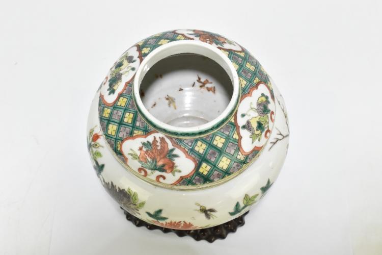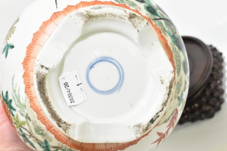 Lot 8 of 1739: A Chinese Famille Verte Wucai porcelain gourd shaped vase, the upper section painted with four panels depicting fruit above the lower body painted with pheasants with lotus flowers in landscape setting, raised on tri-form base with double ring mark to base with carved wood associated stand, height of vase 14cm, overall height 20cm.
