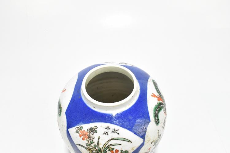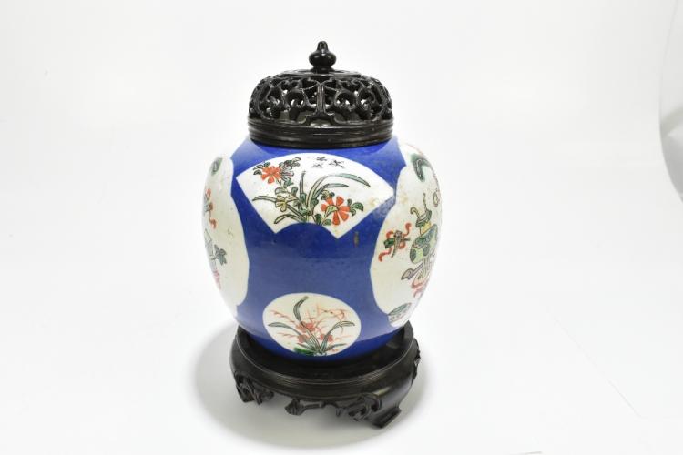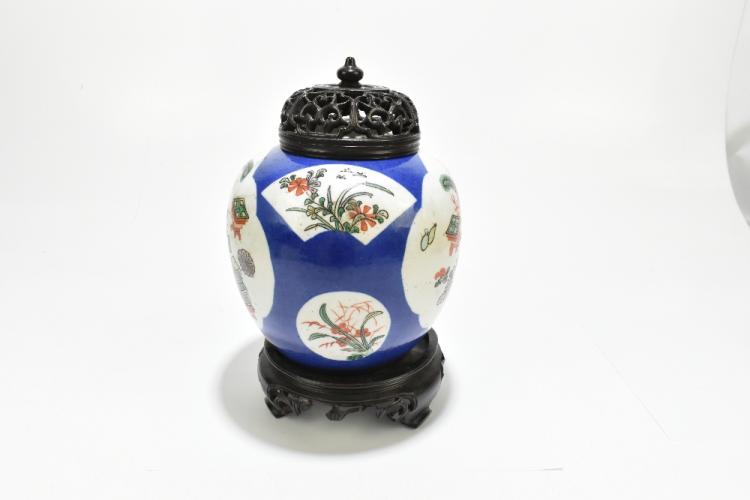 Lot 11 of 1739: A late 19th century Chinese Famille Verte Wucai porcelain ginger jar with associated carved wooden cover and stand, the main body painted in six panels with objects and floral detail on a powder blue body, four character Kangxi mark to base, height of jar 18cm, overall height 28cm.