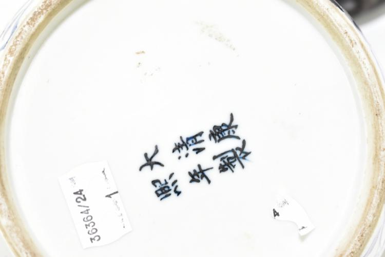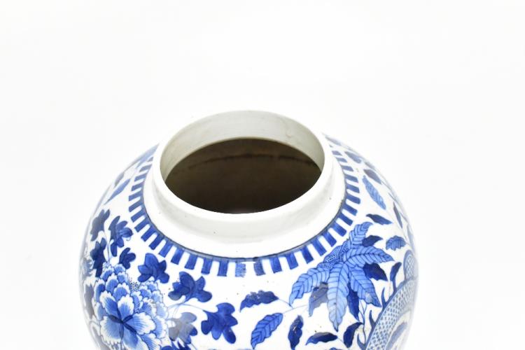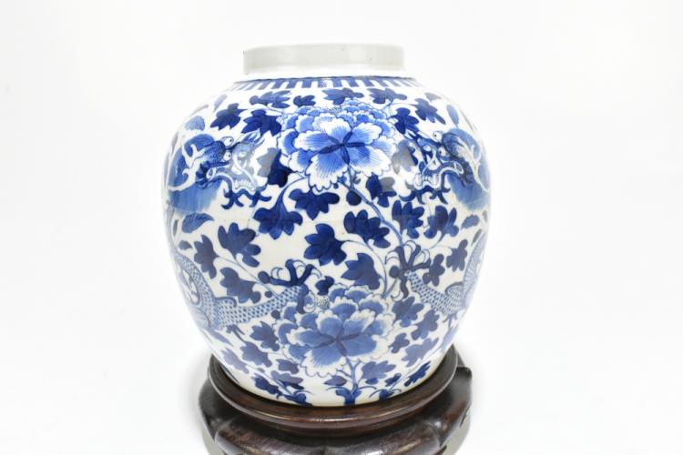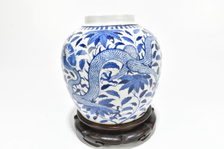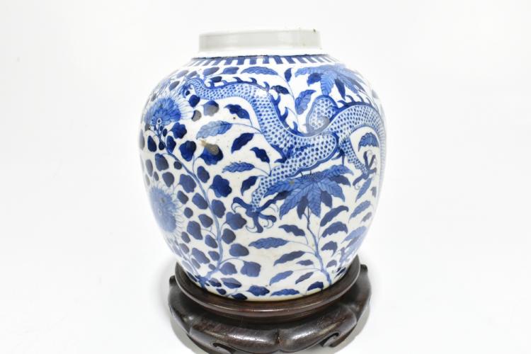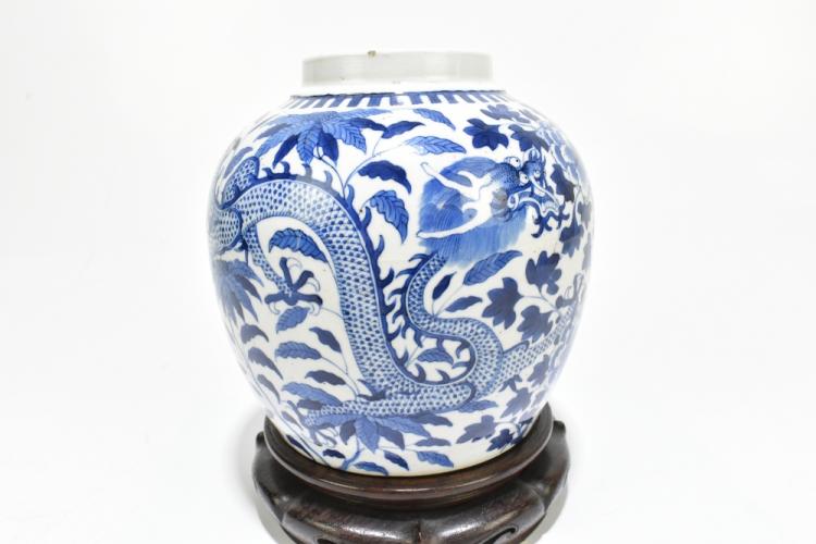 Lot 13 of 1739: A late 19th century Chinese blue and white porcelain ginger jar decorated with a four claw dragon beside lotus flowers and floral sprays, raised on associated wooden stand bearing six character mark to the underside, overall height 21cm.