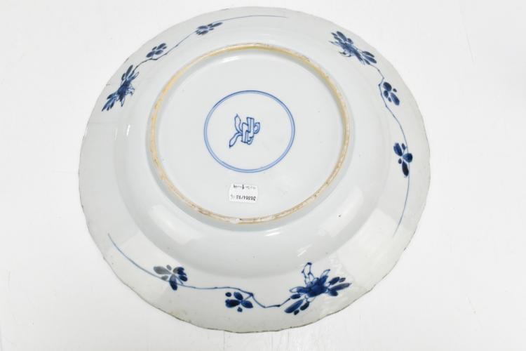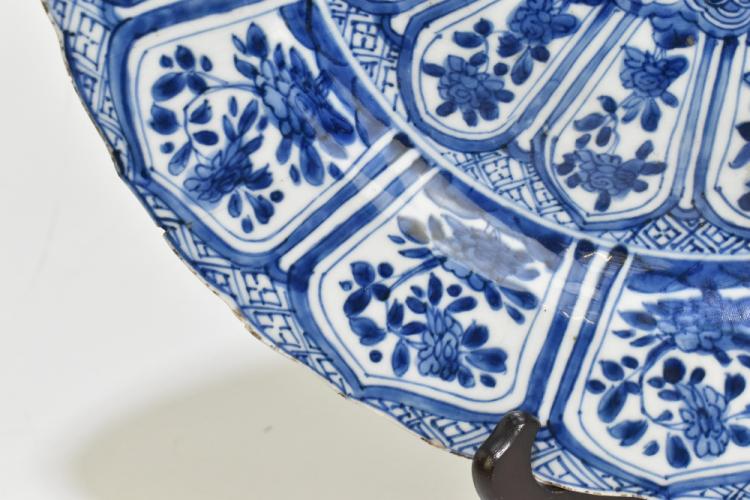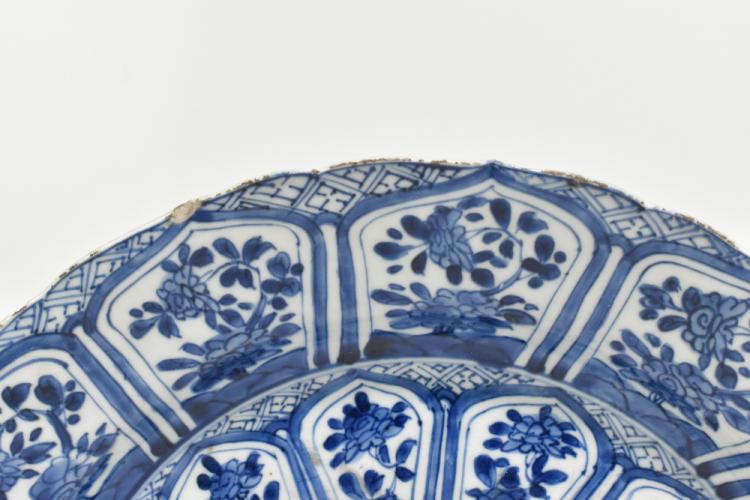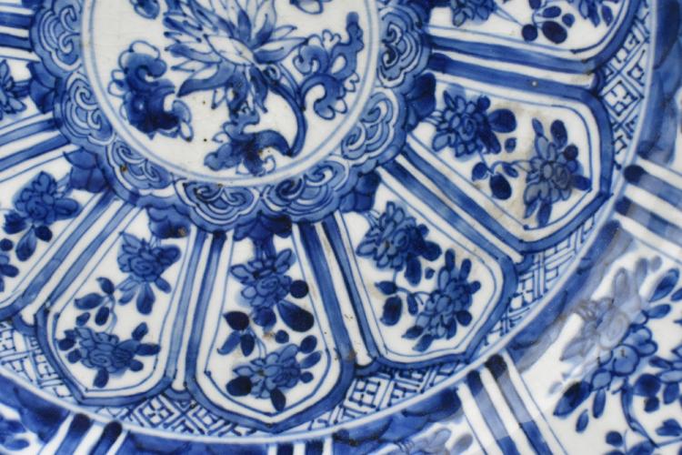 Lot 22 of 1739: An 18th century Chinese Export blue and white porcelain wall charger with central stylised floral detail inside panels of floral sprays in the Dutch style bearing double ring and lozenge style mark to the underside, diameter 35cm.