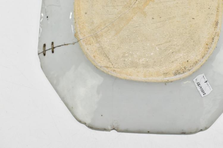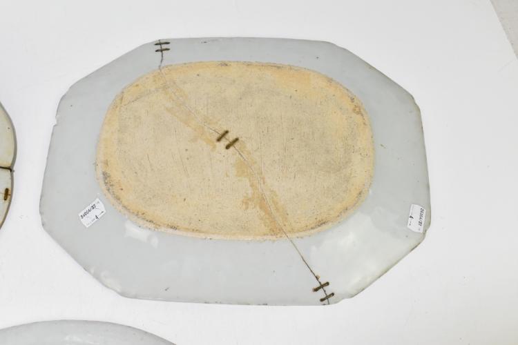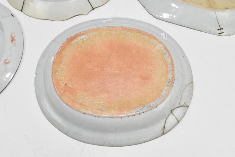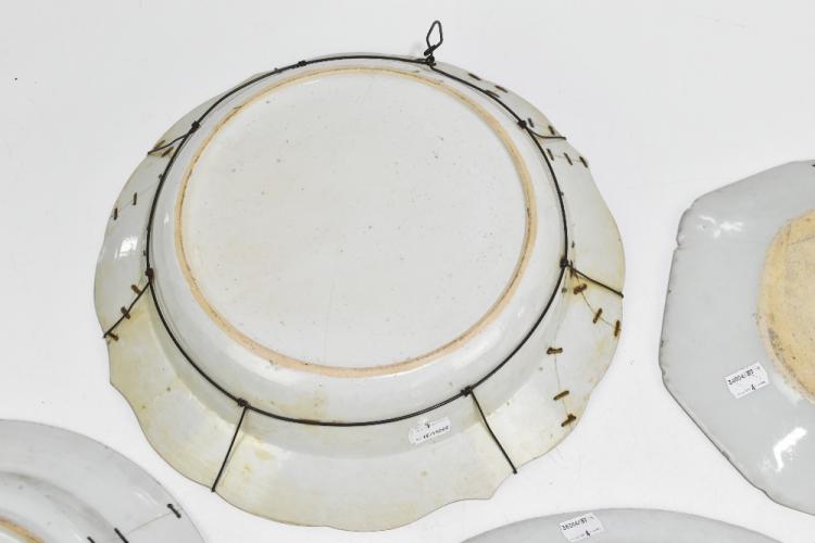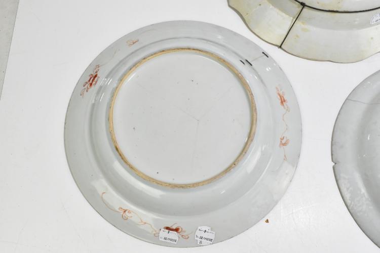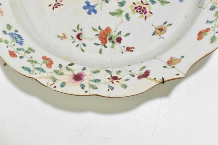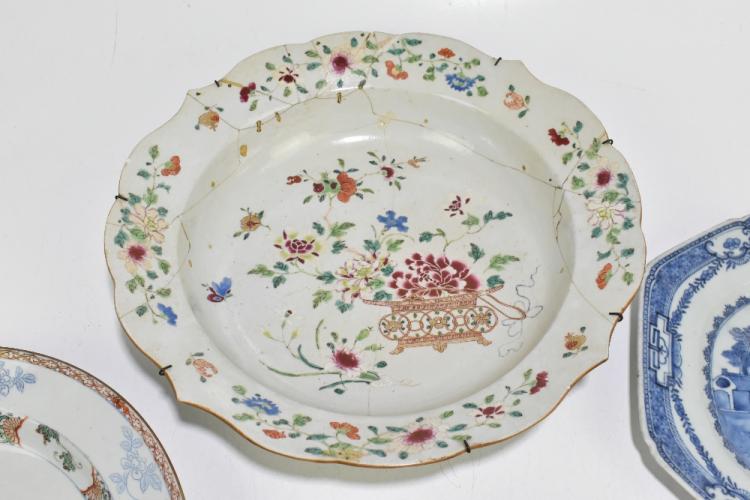 Lot 24 of 1739: Four pieces of 18th century Chinese Export including a large Famille Rose bowl with scalloped edge, decorated with floral sprays, diameter 38cm, two blue and white meat plates including an oval example decorated with lotus flowers and a further Famille Verte charger, diameter 34.5cm (af) (4).
