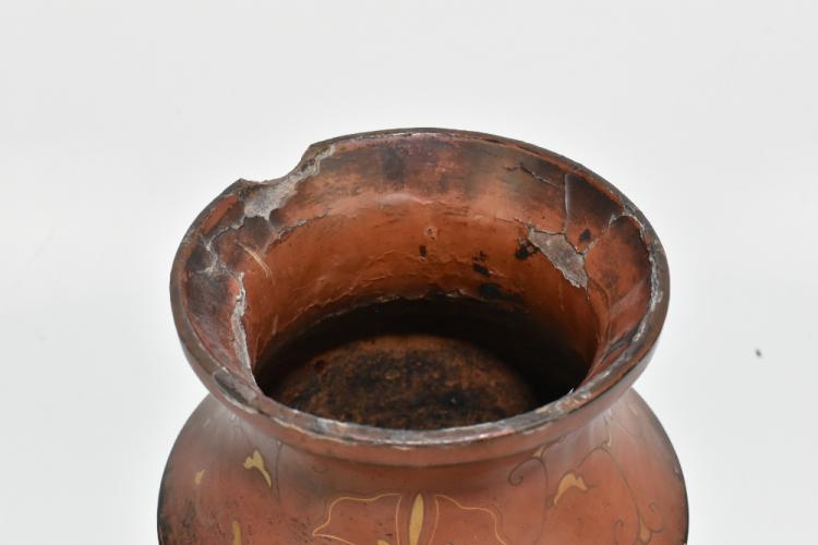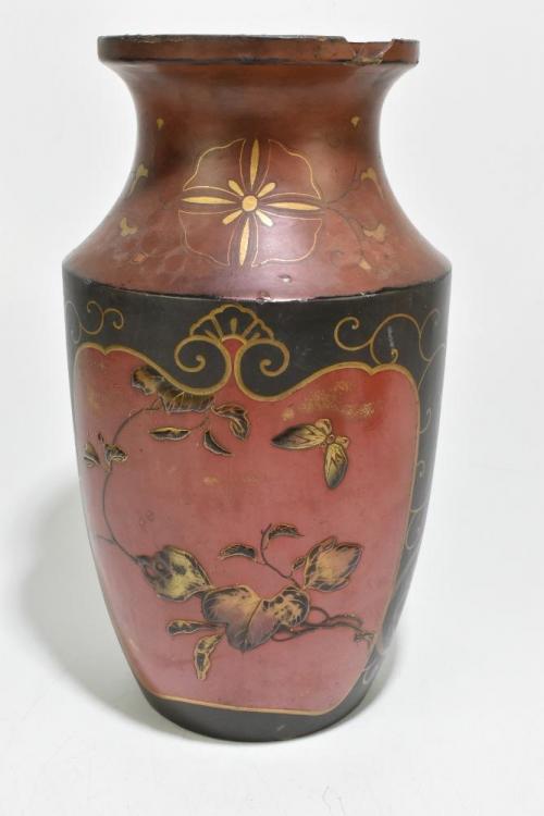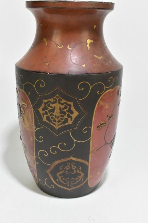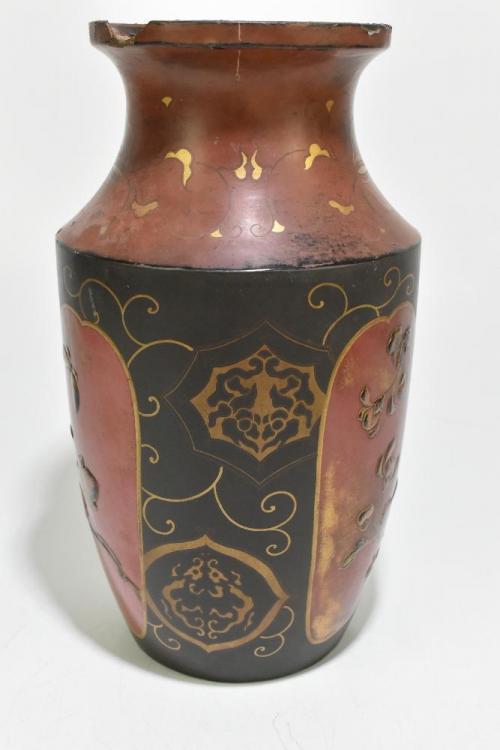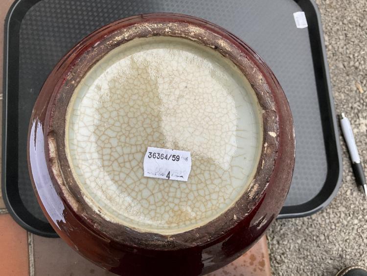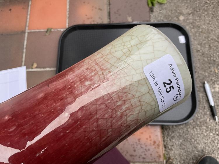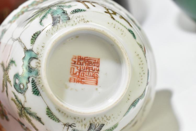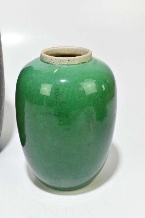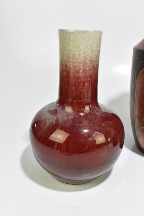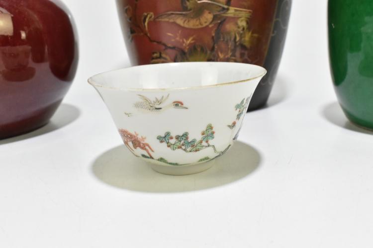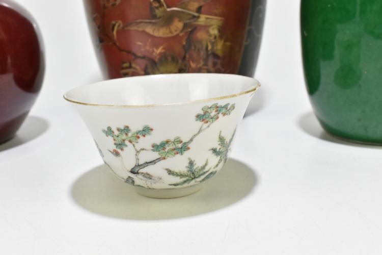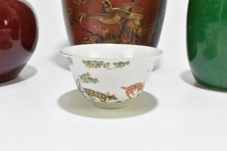Lot 25 of 1739: A Chinese Famille Rose porcelain footed tea bowl decorated with deer and exotic birds in landscape, bears seal mark to underside, height 6cm, diameter 10.5cm and a Chinese Sang de Boeuf glazed vase, height 28cm, a green crackle glazed jar, height 18cm and a Chinese lacquered vase with chinoiserie decoration, height 33.5cm (4).