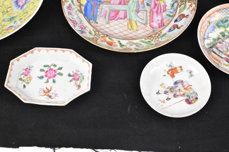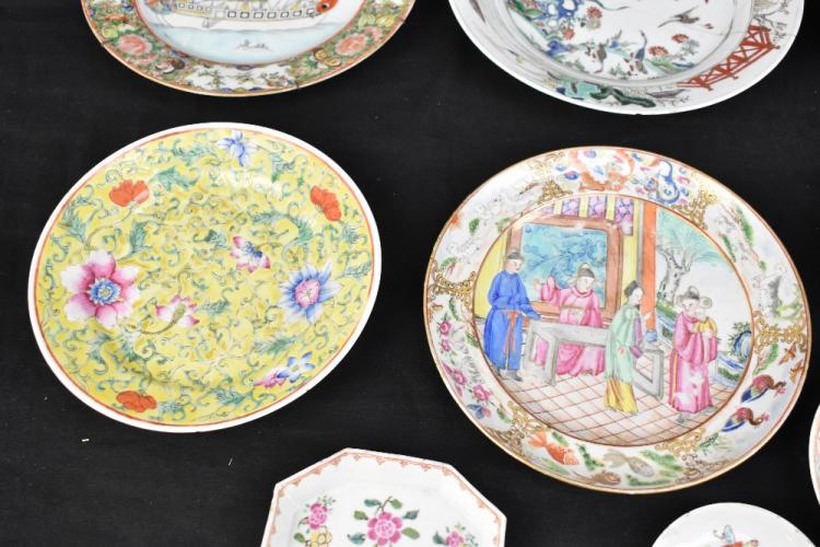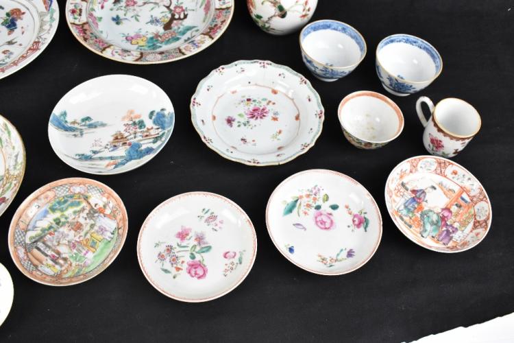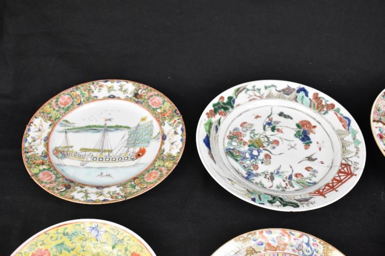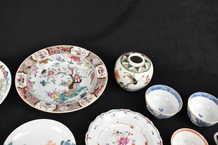 Lot 27 of 1739: A group of Chinese porcelain including 18th century Famille Rose bowl, a similar Famille Verte plate, a later Canton plate decorated with sailing vessels, various saucers, tea bowls, etc.