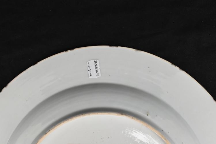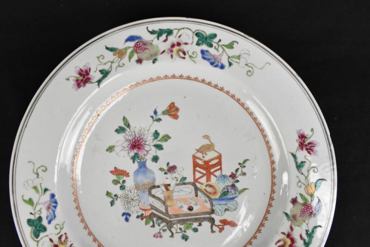 Lot 28 of 1739: An 18th century Chinese porcelain Famille Rose wall charger decorated with objects to the centre inside floral sprays, diameter 39cm, bears Walker Galleries Ltd of North Yorkshire label to the underside.
