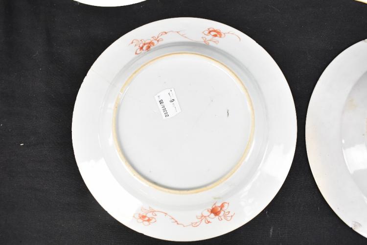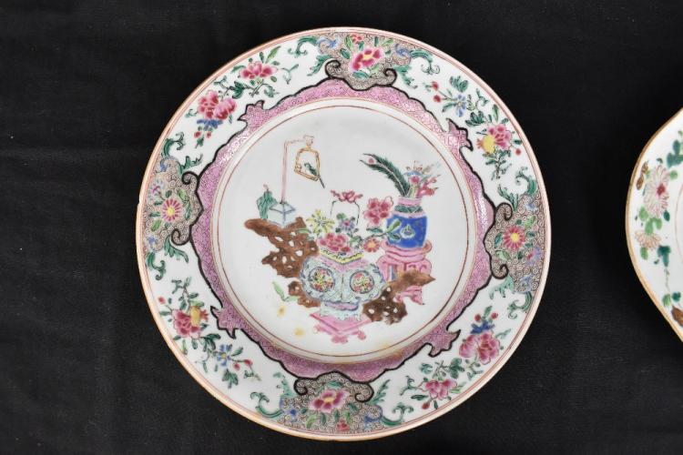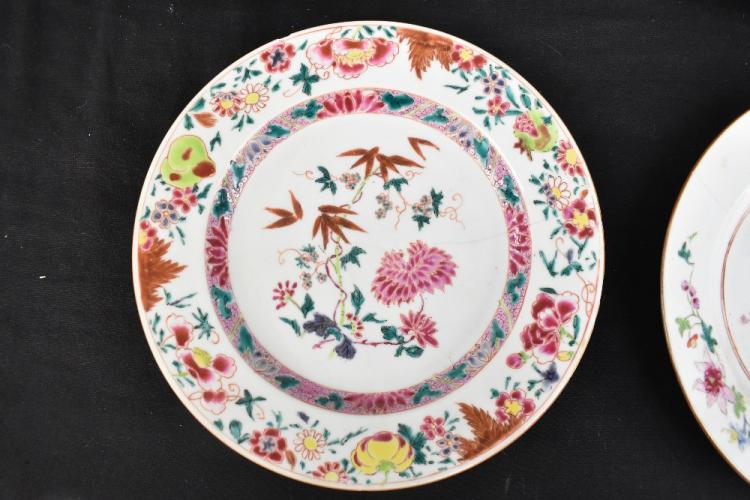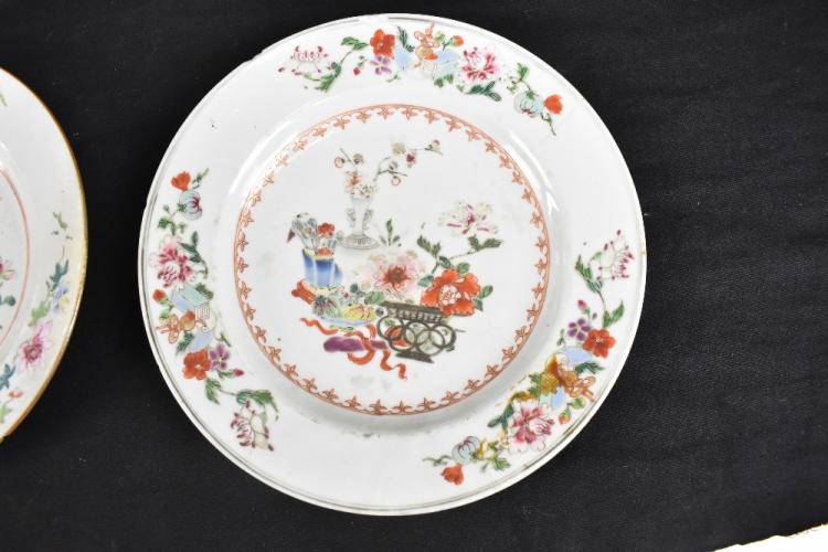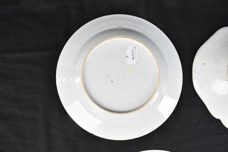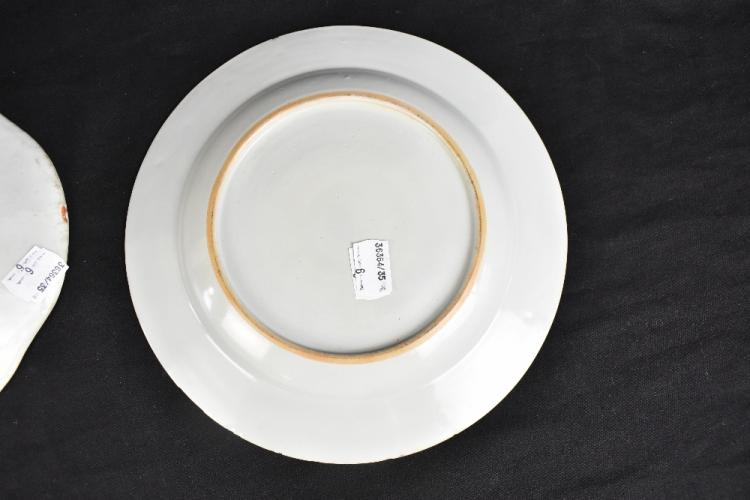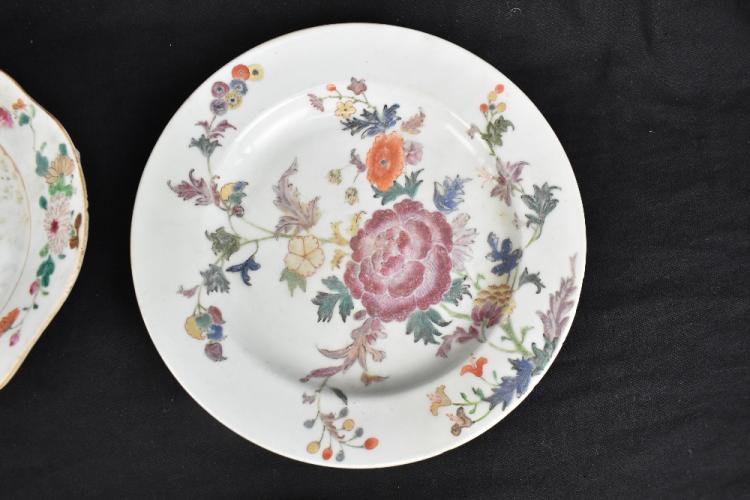 Lot 29 of 1739: An 18th century Chinese Export Famille Rose oval platter with floral decoration, 27 x 37cm and five 18th century Chinese porcelain plates including a Famille Rose example decorated with objects, average size 22.5cm (6).
