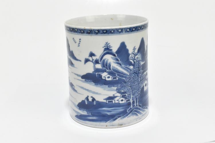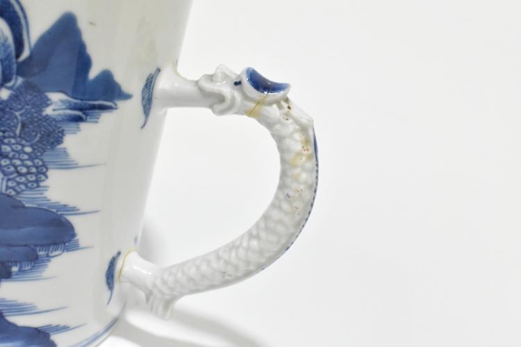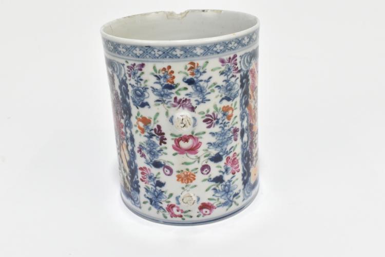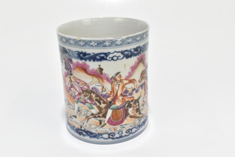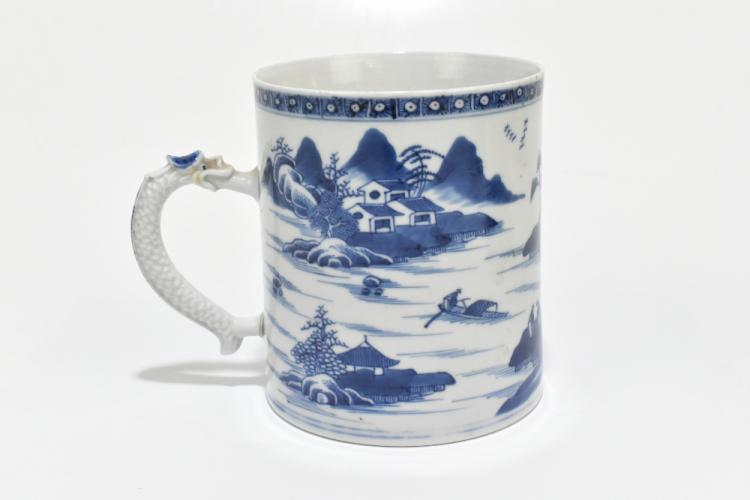 Lot 30 of 1739: An 18th century Chinese Export blue and white mug decorated with a landscape scene and applied moulded dragon handle, height 13cm and a similar Famille Rose example decorated with figures on horseback, height 13cm (2).