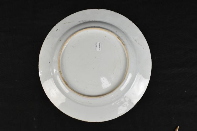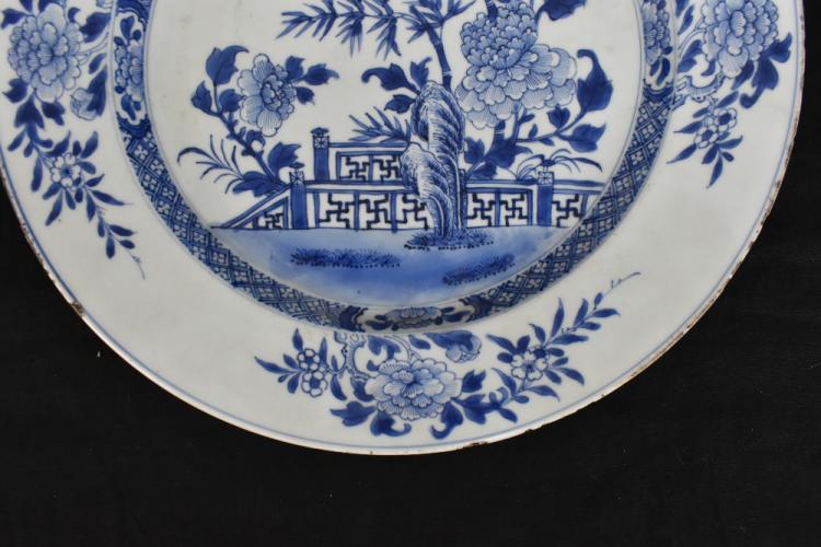 Lot 31 of 1739: An 18th century Chinese Export blue and white porcelain wall charger decorated with lotus flowers and bamboo beside fence in landscape setting, diameter 35.5cm.