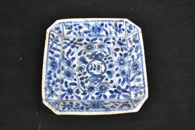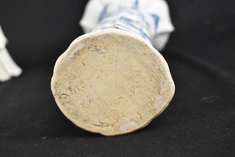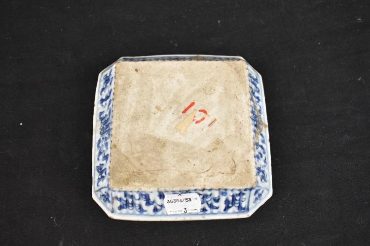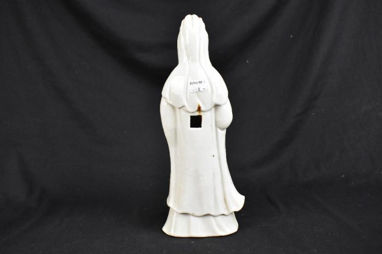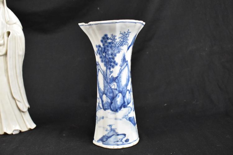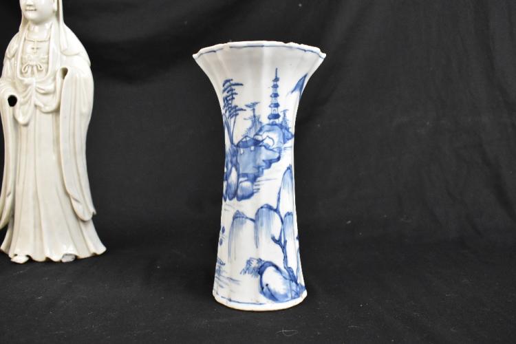 Lot 46 of 1739: A late 19th century Chinese Blanc de Chine Guan Ying, height 33cm and a Chinese 18th century blue and white trumpet vase decorated with a landscape scene, height 21cm and a similar blue and white dish of square form (3).