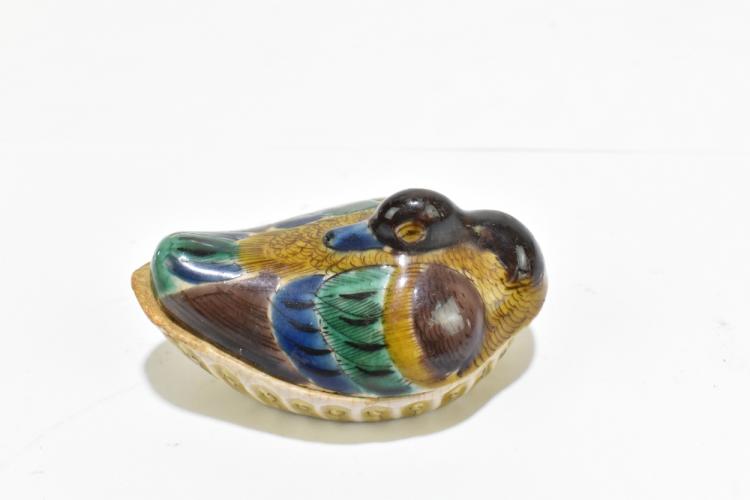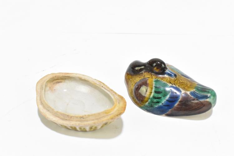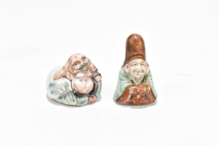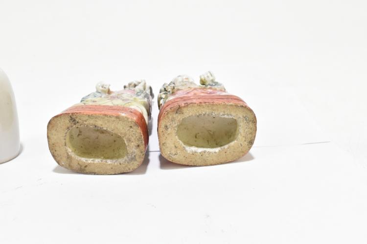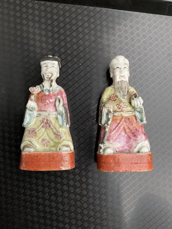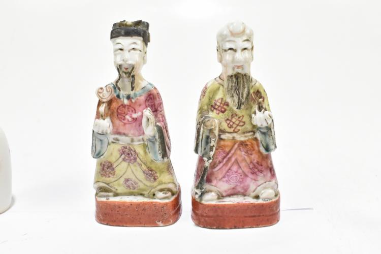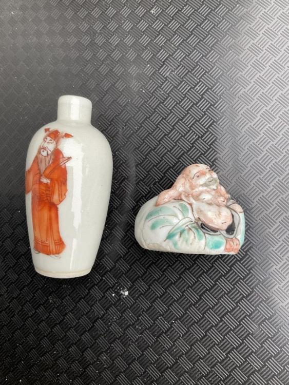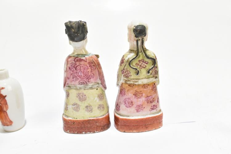 Lot 47 of 1739: A group of Chinese ceramics including a Famille Rose figure of a boy playing a drum, snuff bottle decorated with an elder on an iron red ground, a pair of Famille Rose figures representing immortals, one holding a ruyi head (7).