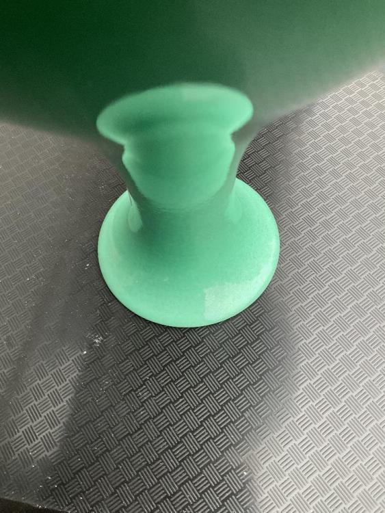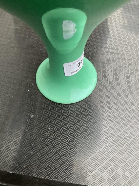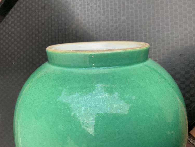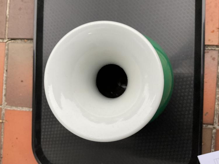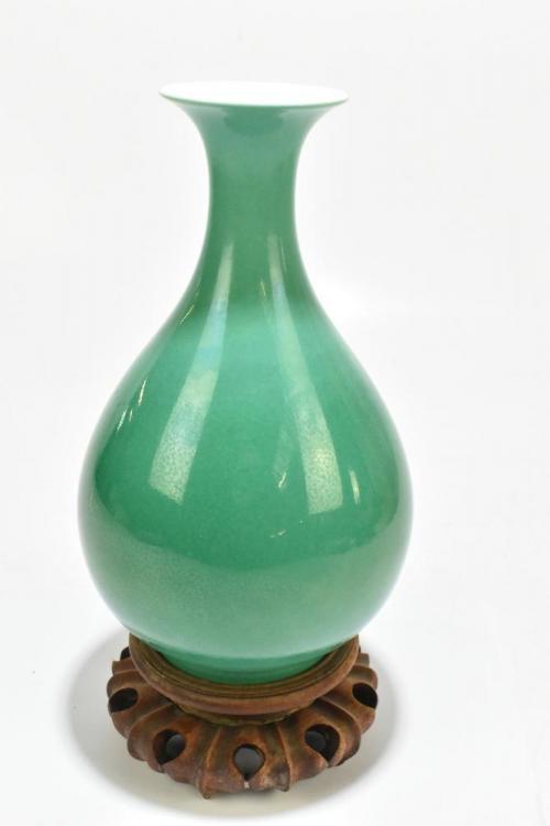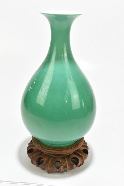 Lot 48 of 1739: A Chinese porcelain apple green glazed Yuhuchunping shaped vase, bears Qianlong seal mark and museum/collection no. R.V.471 to the underside, raised on associated stand, height of vase 27cm, overall height 33cm.