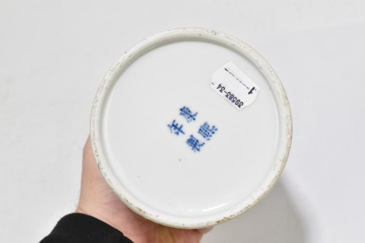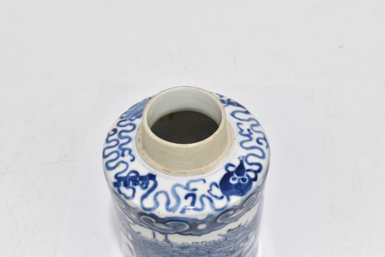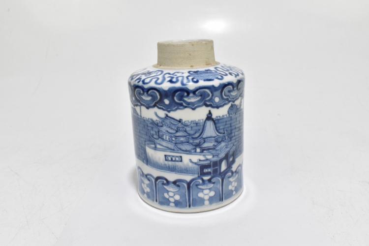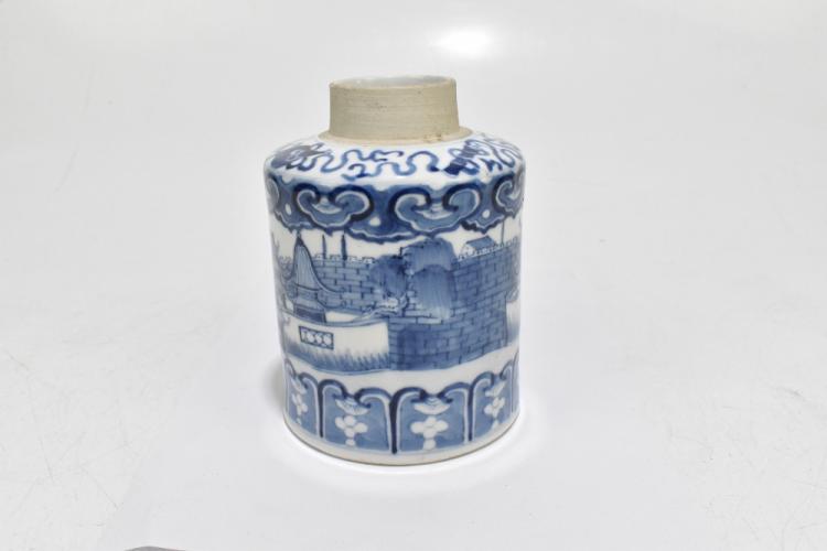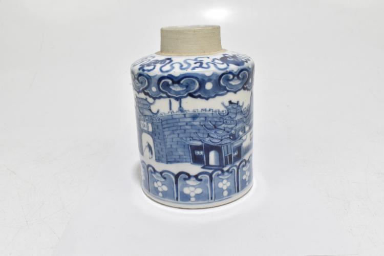 Lot 50 of 1739: A late 19th century Kangxi style blue and white tea canister, decorated throughout with an encircling pattern of a fortress, lacking lid, four character seal mark to underside of base, height 14.5cm.