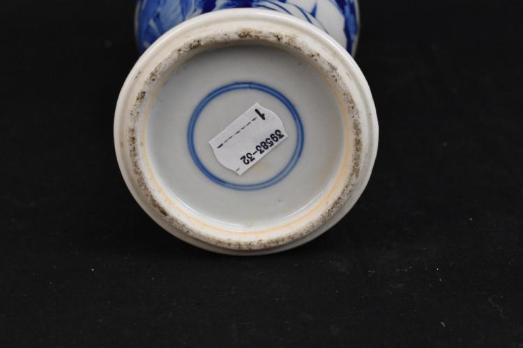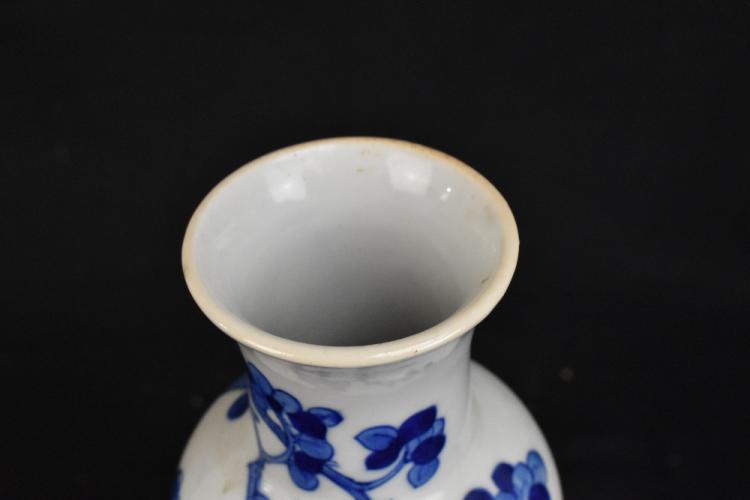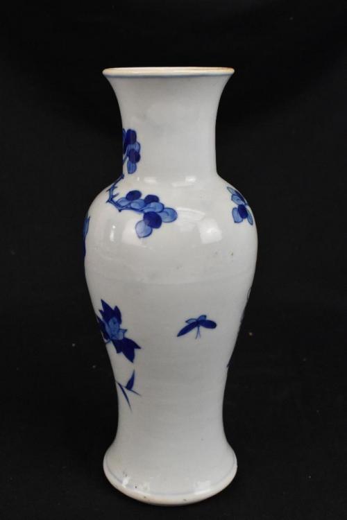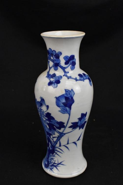 Lot 52 of 1739: A late 19th century Chinese Kangxi style blue and white vase, decorated with two birds and flowers around rock work, concentric circle mark to the underside of the base, height 26cm.