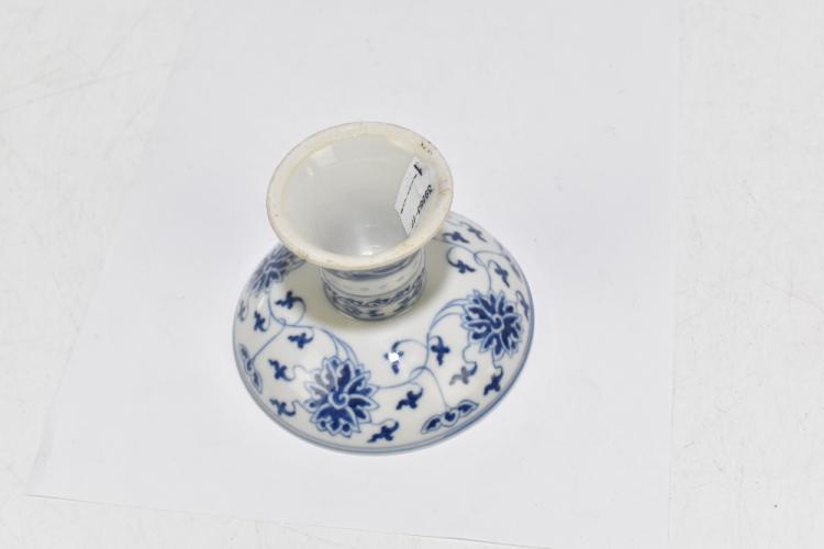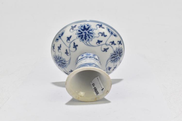 Lot 58 of 1739: A Chinese blue and white stem cup, the upper section decorated throughout with flowers, the flared base decorated with a wave pattern, diameter 10.75cm, height 7cm.