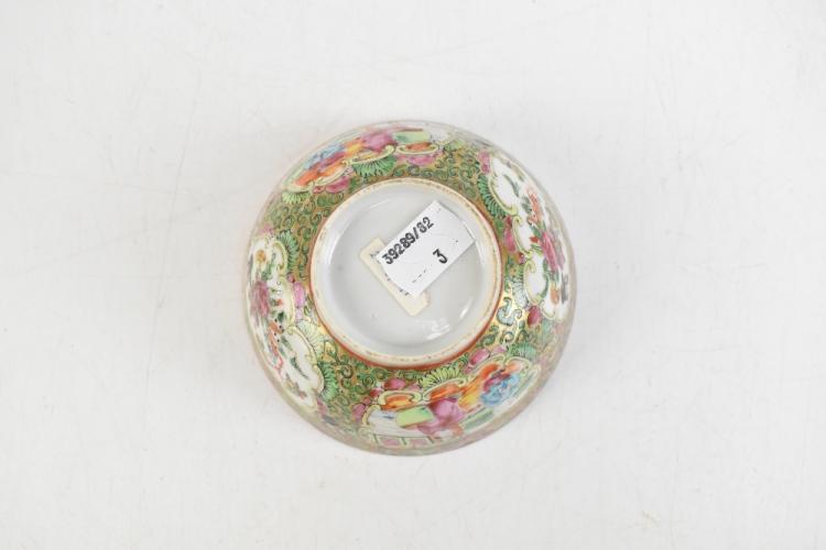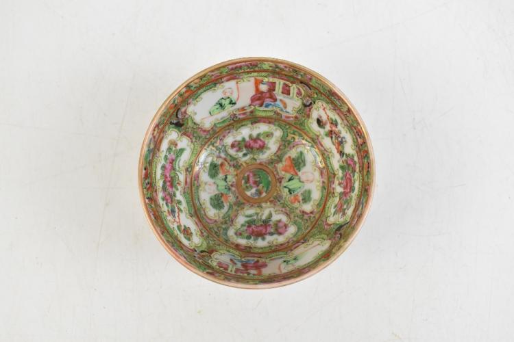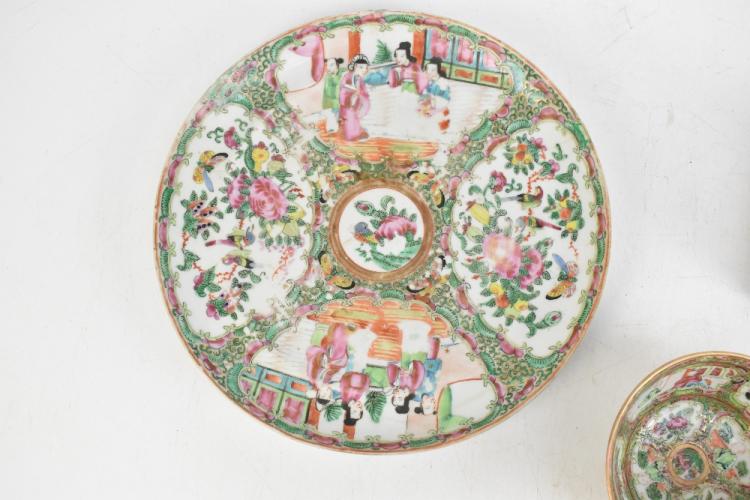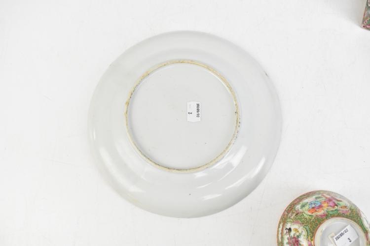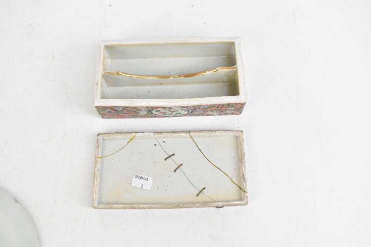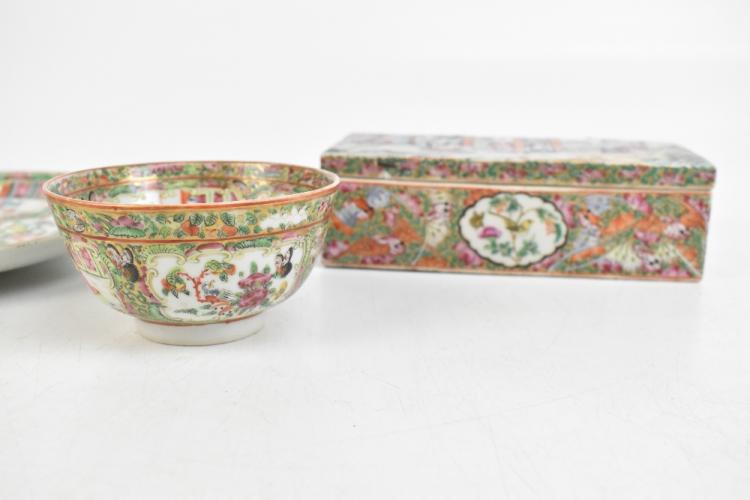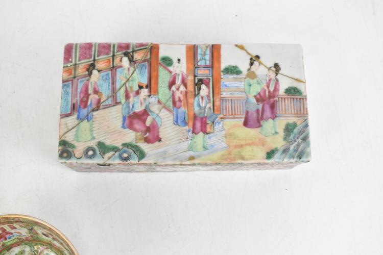 Lot 63 of 1739: A 19th century Chinese Canton Famille Rose rectangular lidded box, decorated with figures in landscape setting, length 19cm, together with a Canton Famille Rose bowl and plate, (3).
