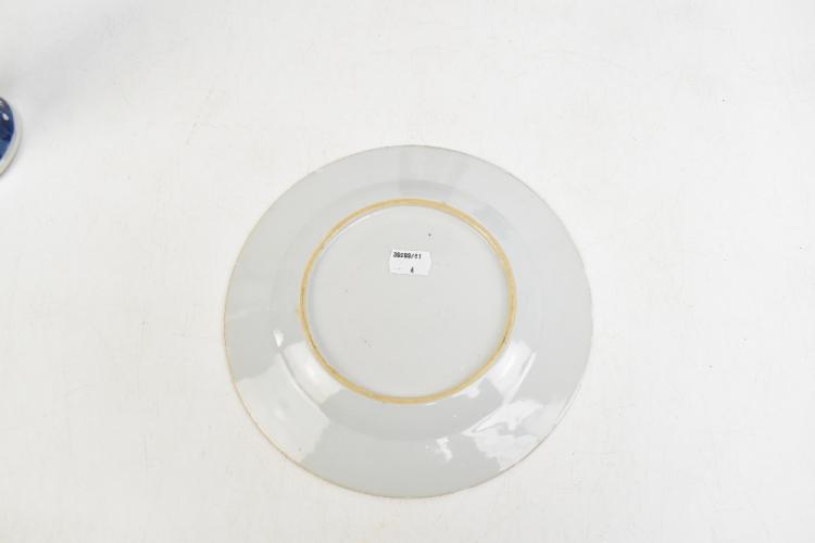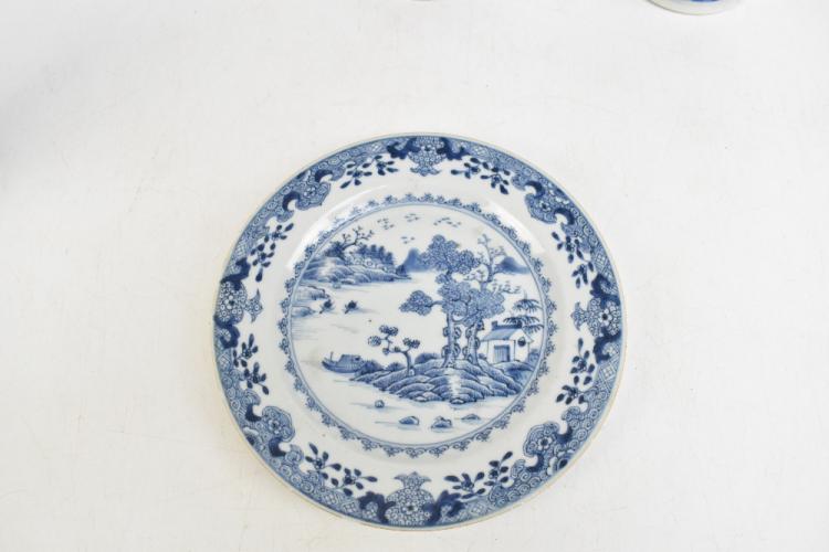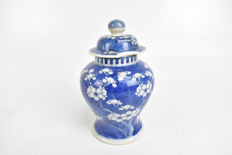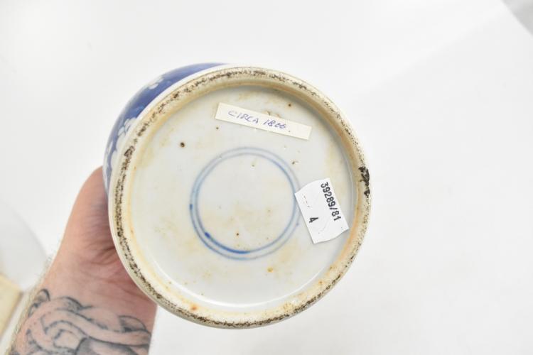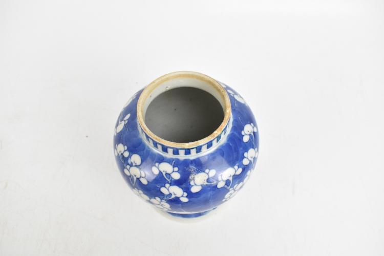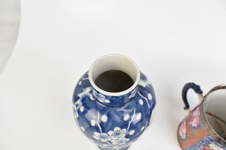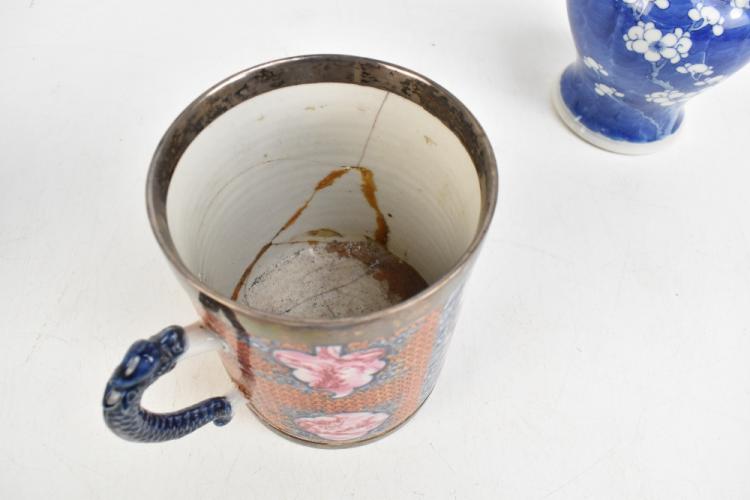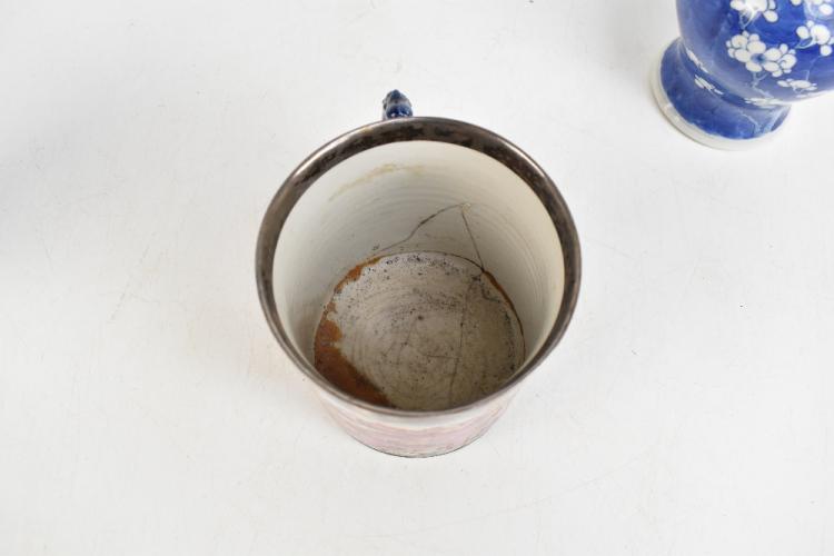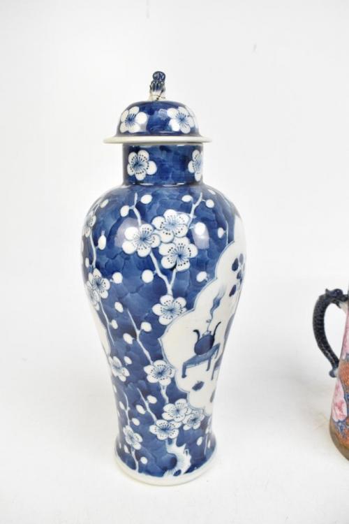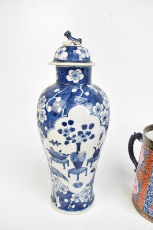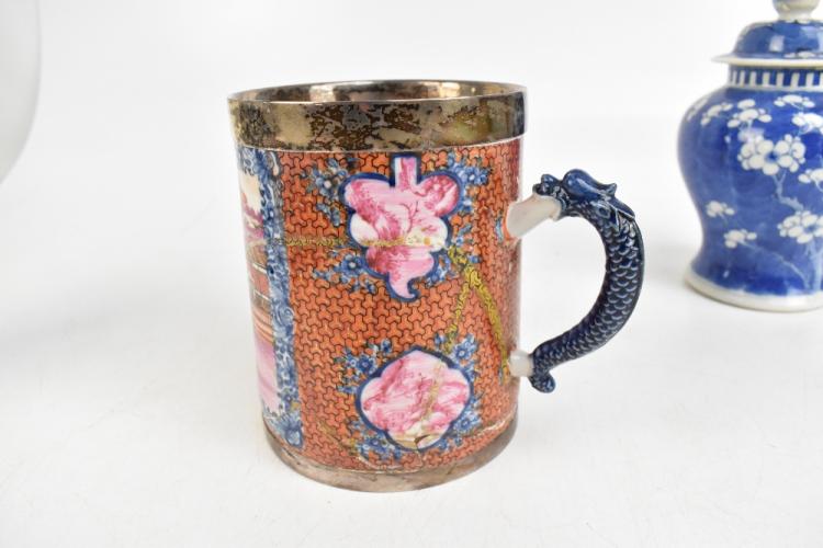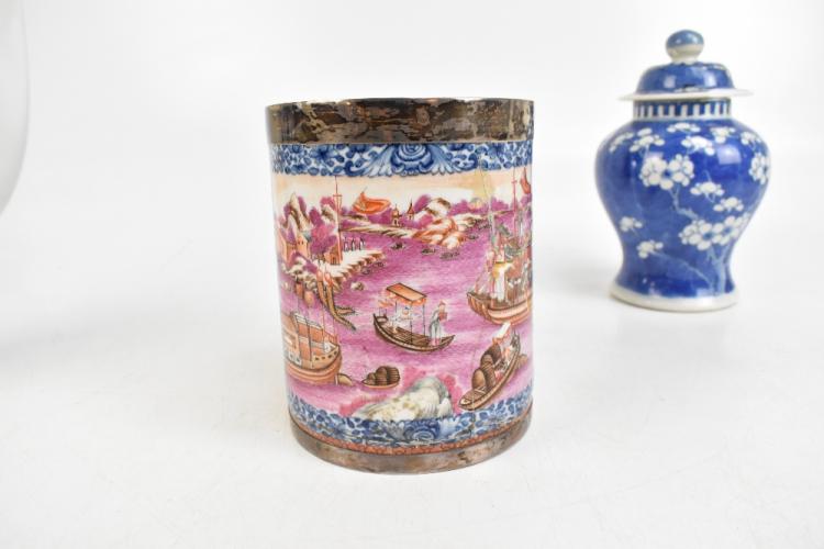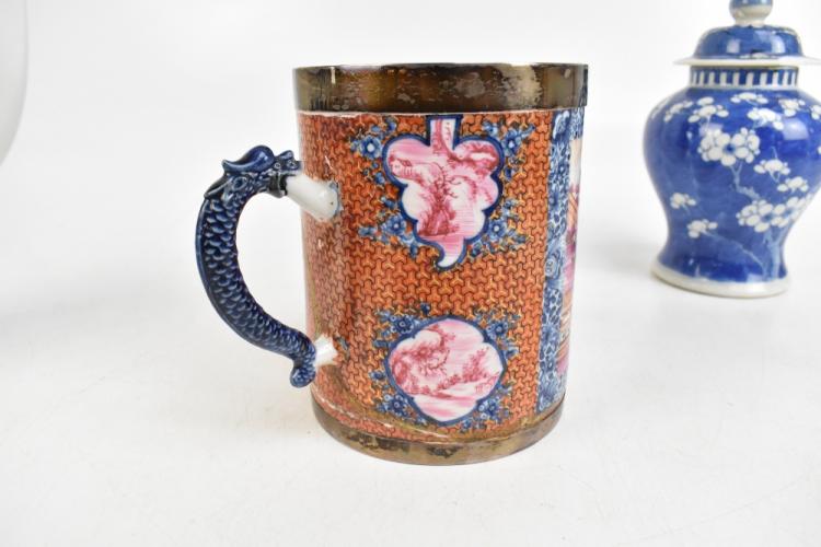 Lot 64 of 1739: An 18th century Chinese Famille Rose porcelain mug, decorated with panels depicting figures in junks and floral sprays with dragon handle and white metal mounts, height 15cm, together with an early 20th century Chinese blue and white porcelain temple jar and cover, decorated with objects in a prunus border, height 30cm, an early 20th century Chinese porcelain jar and cover decorated with prunus flowers on a blue ground with double ring Kangxi mark to base, also an 18th century Chinese blue and w