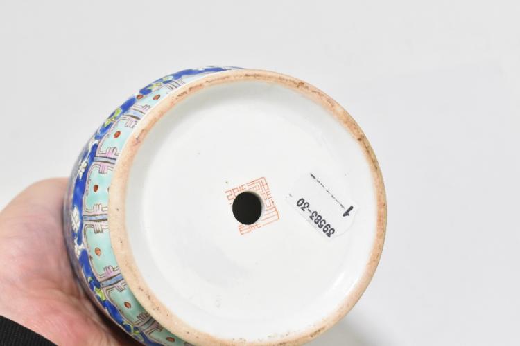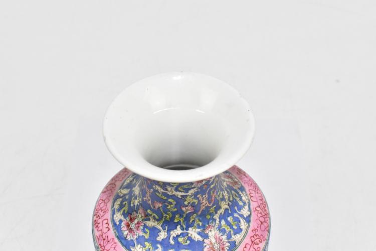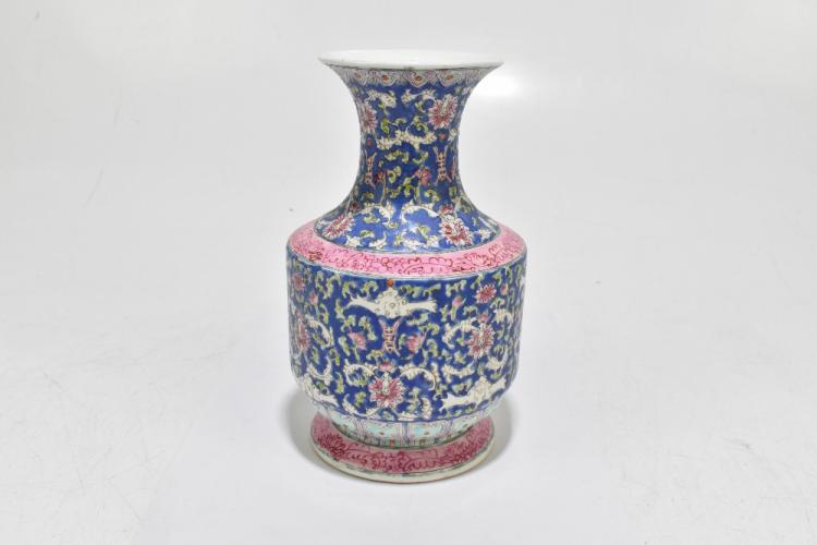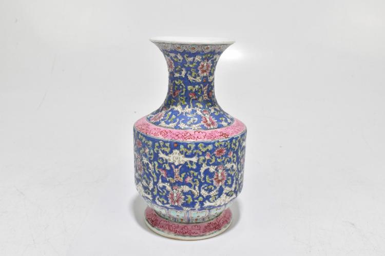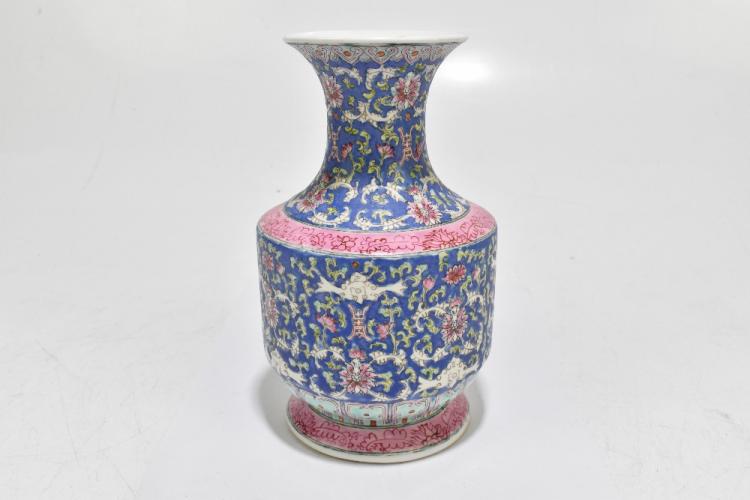 Lot 73 of 1739: An early 20th century Chinese Imperial Famille Rose vase decorated throughout with floral motifs against a blue and pink ground, seal mark to the underside of the base which has been drilled through, height 19cm.