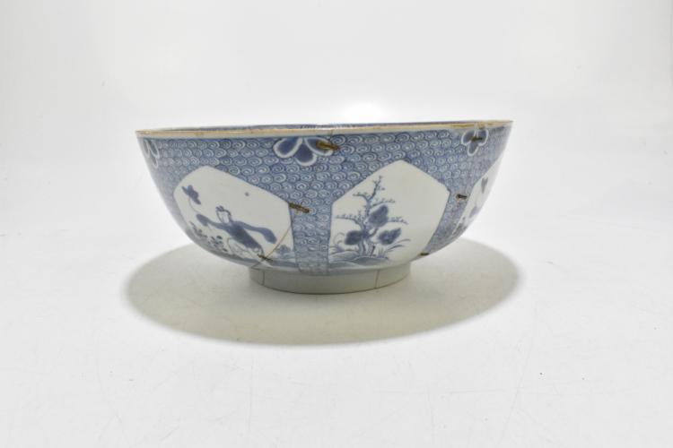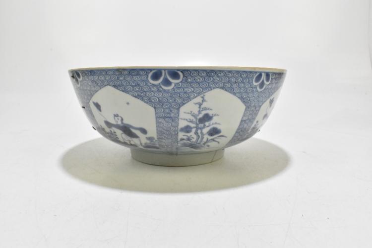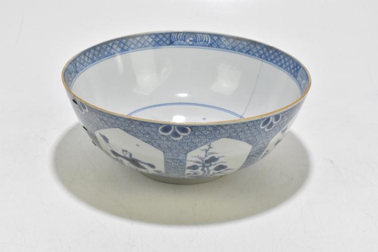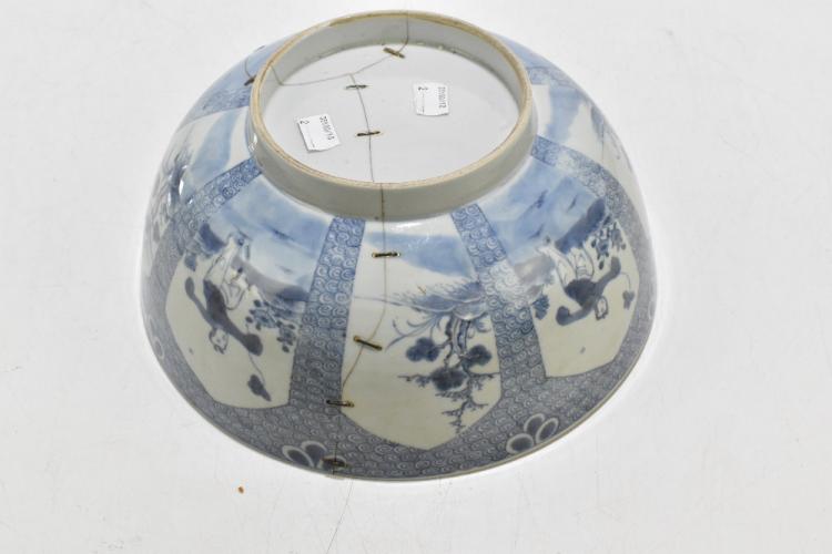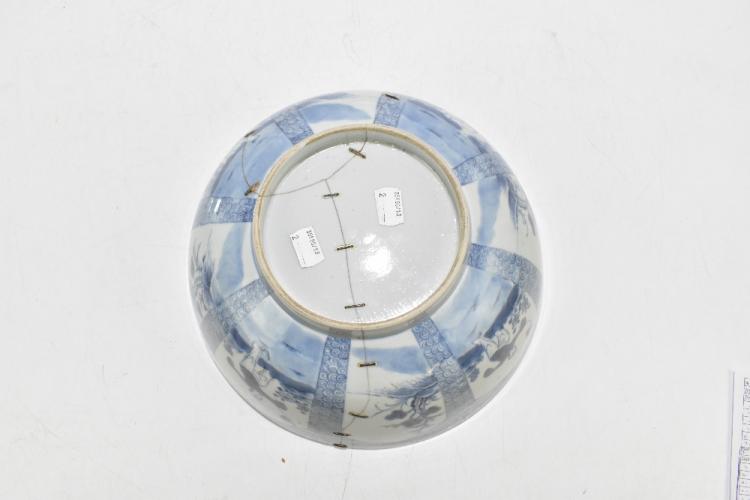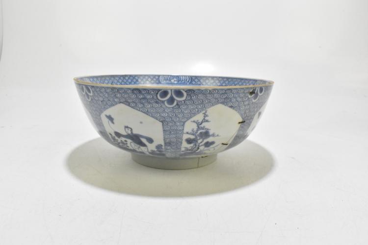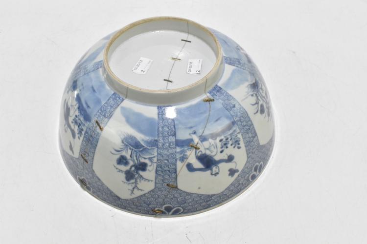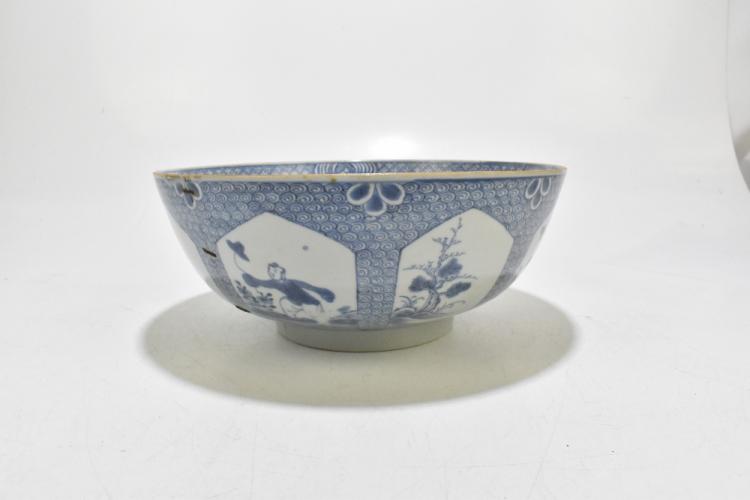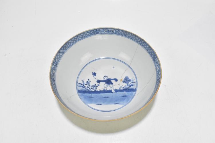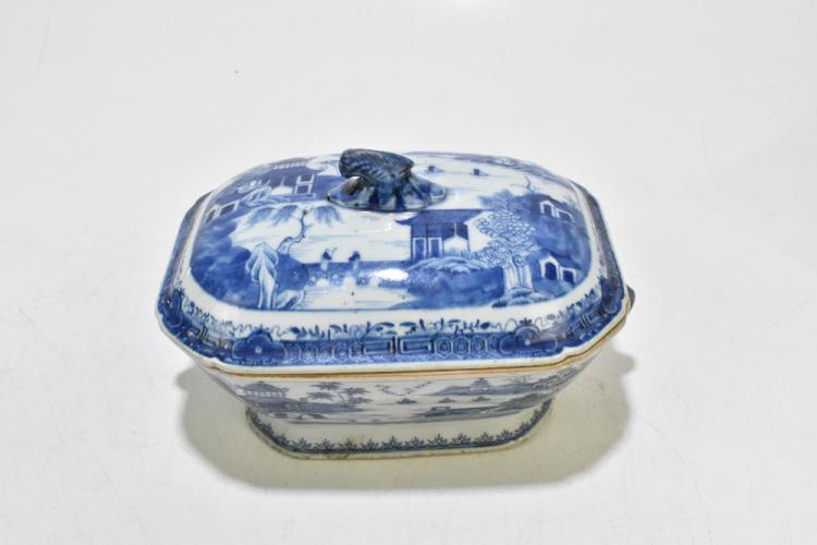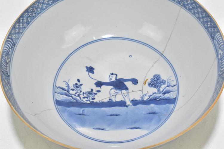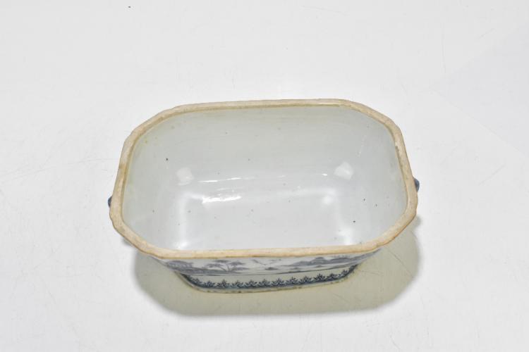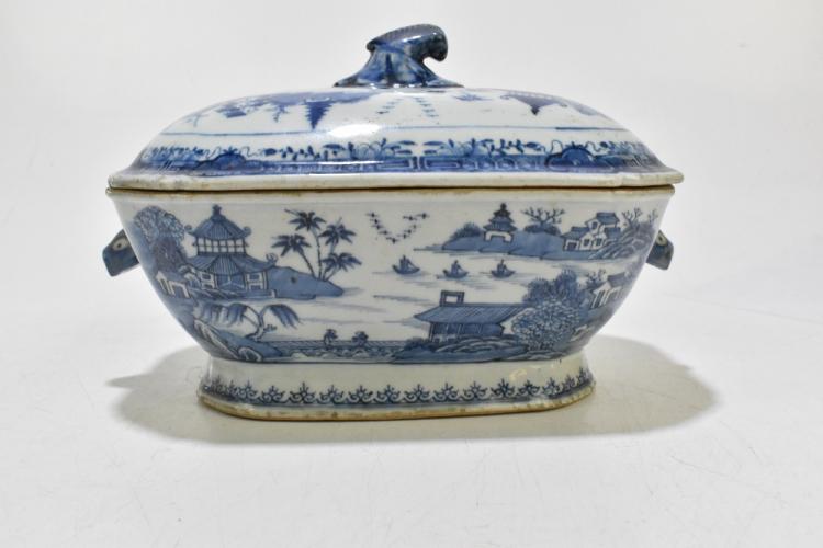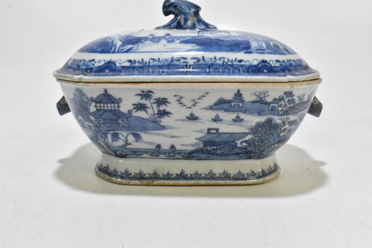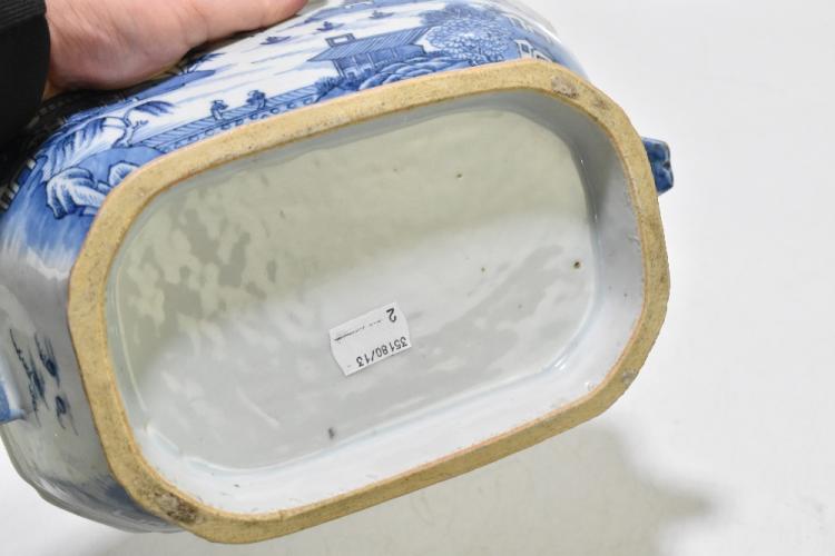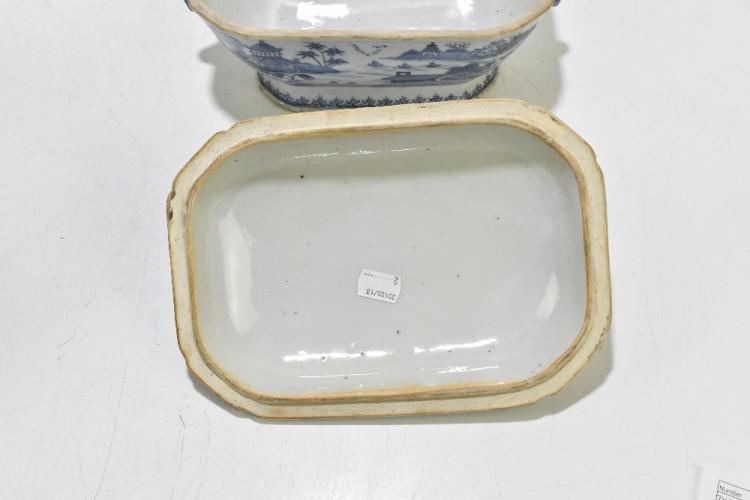 Lot 77 of 1739: An 18th century Chinese Export blue and white tureen and cover, decorated in a variant of the willow scene, with mask head handles, length 26cm, height 16cm, together with an 18th century Chinese blue and white footed bowl, decorated with a boy picking flowers to the interior and with panels depicting floral sprays and children to the outside, diameter 29.5cm, (part af) (2).