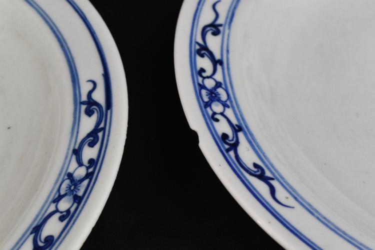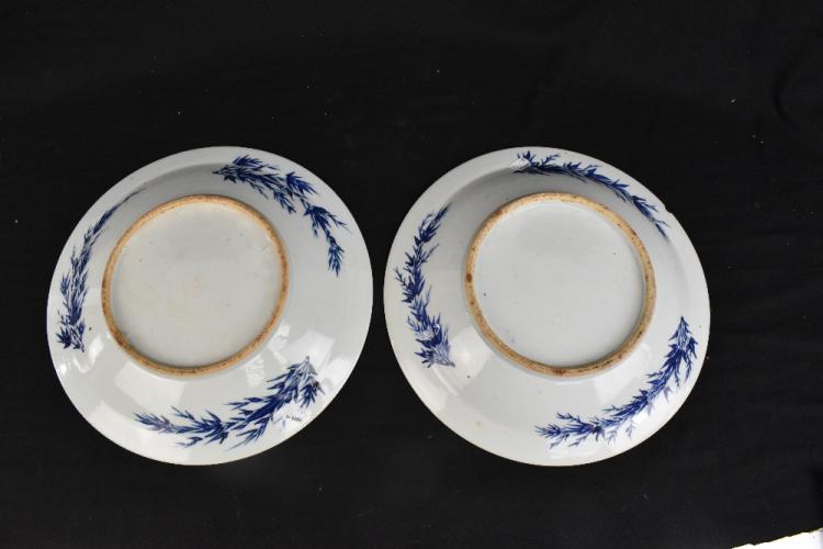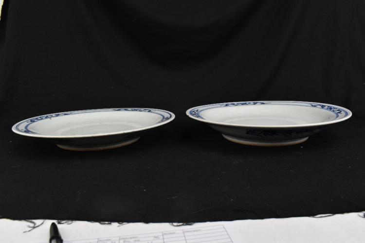 Lot 78 of 1739: A pair of Chinese blue and white chargers, the rims decorated with concentric circles with flower head motifs, the undersides with bamboo sprigs, diameter 37.5cm.