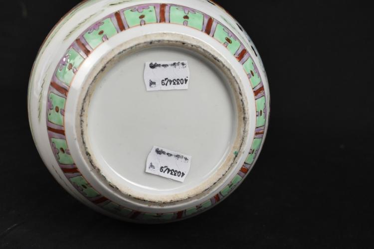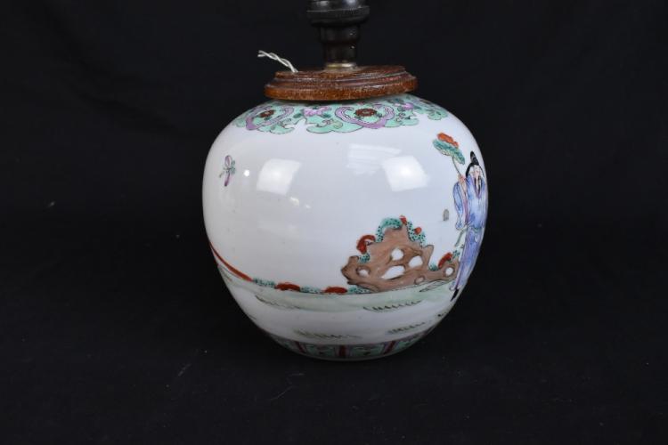Lot 79 of 1739: A Chinese Famille Verte ginger jar painted with figures in a landscape and now converted to a lamp, height of jar 17cm.