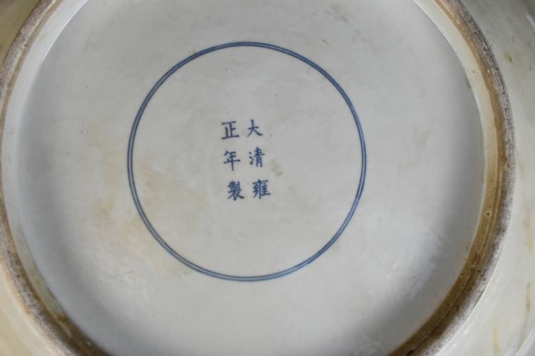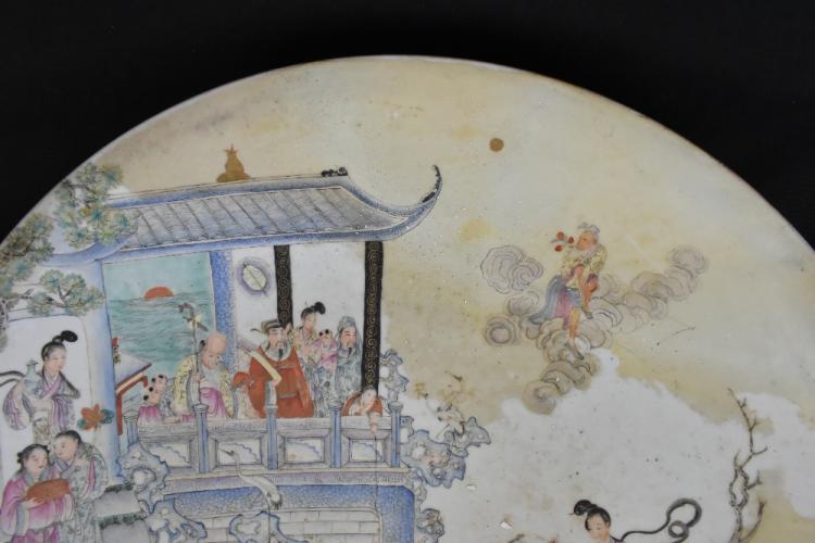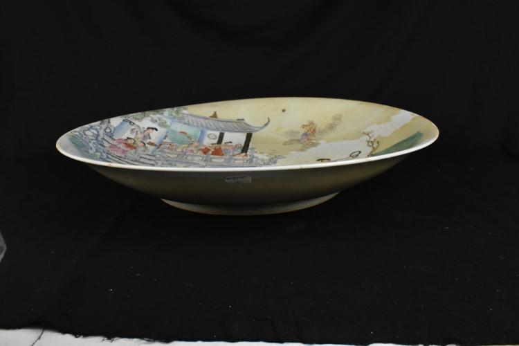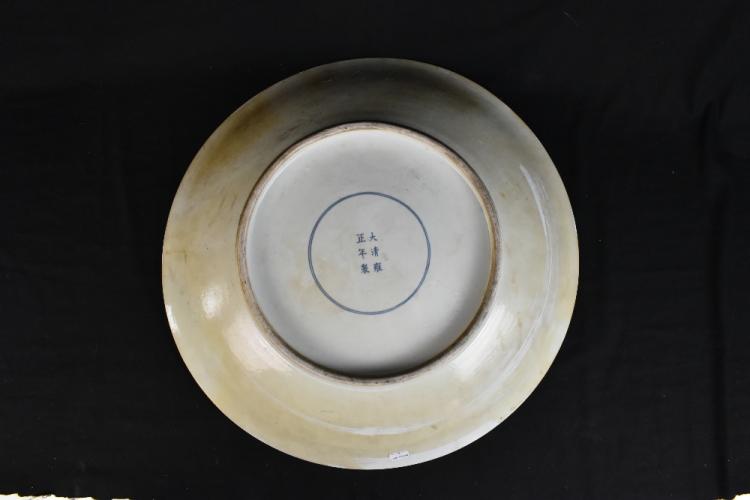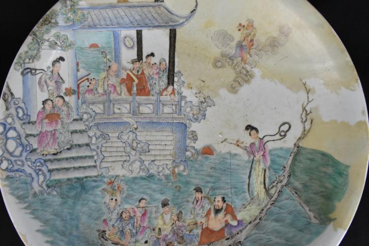 Lot 81 of 1739: A large Chinese Famile Verte porcelain wall charger painted in enamels with figures in a Sampan beside a pakoda, blue painted double ring and Yongzheng mark to the underside, diameter 54.5cm (af).
