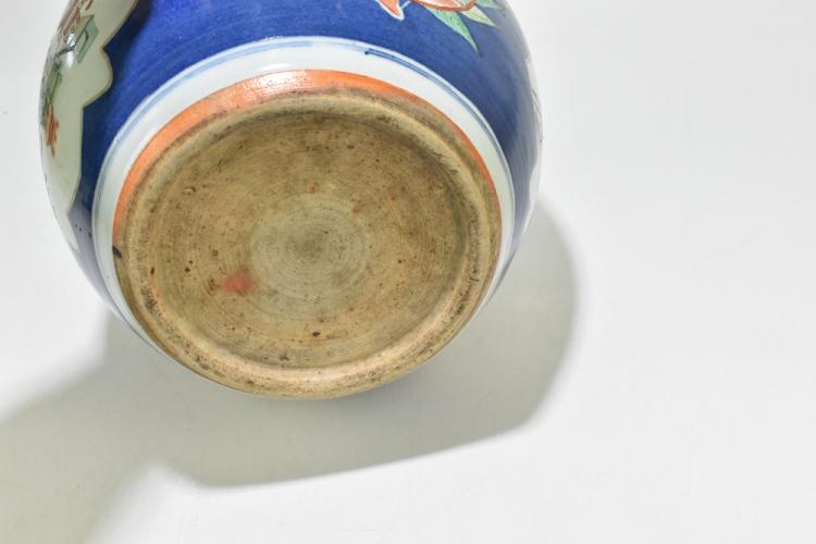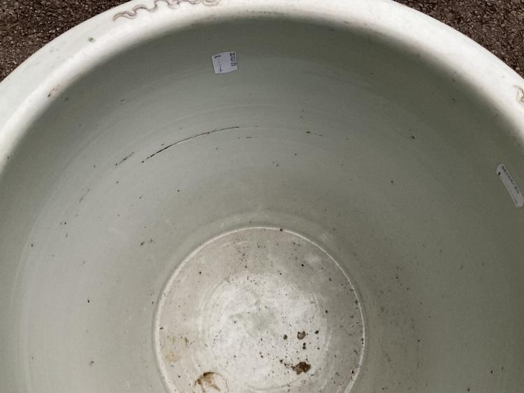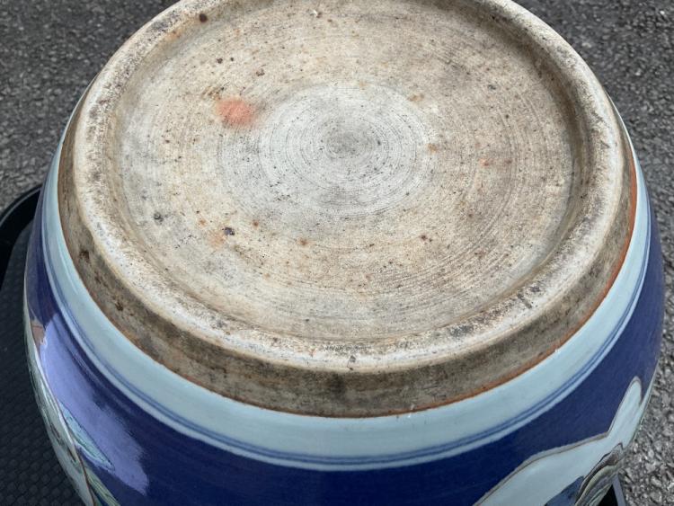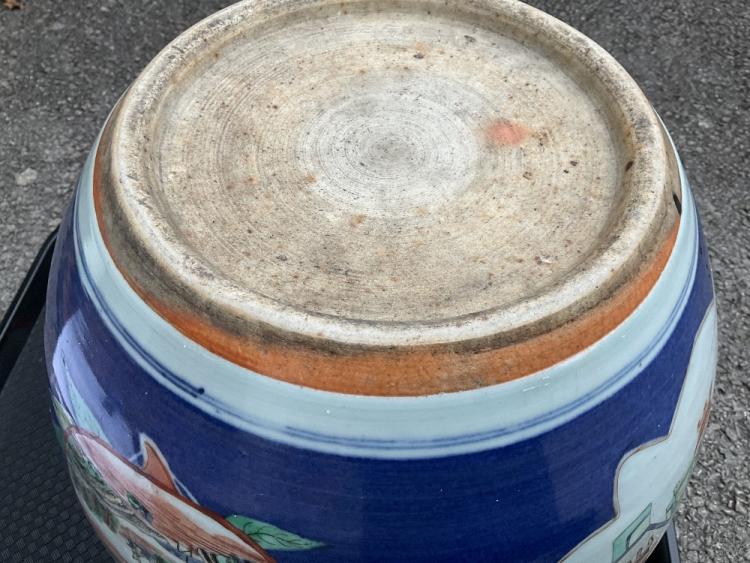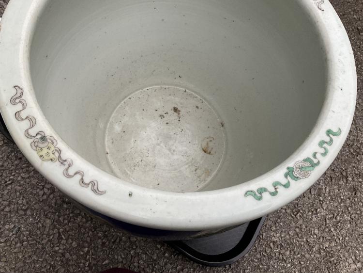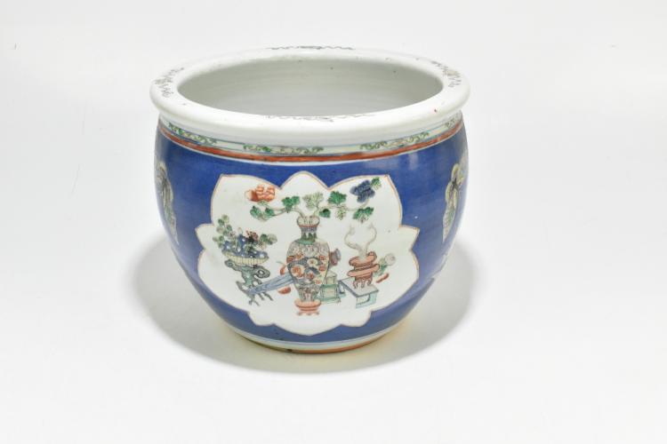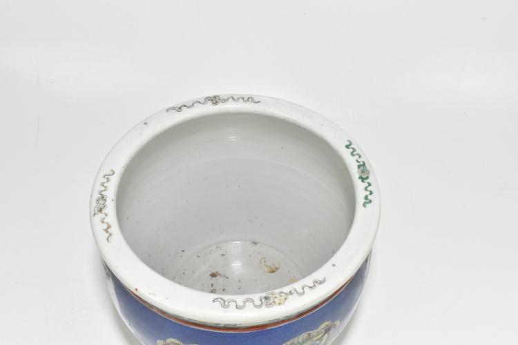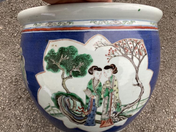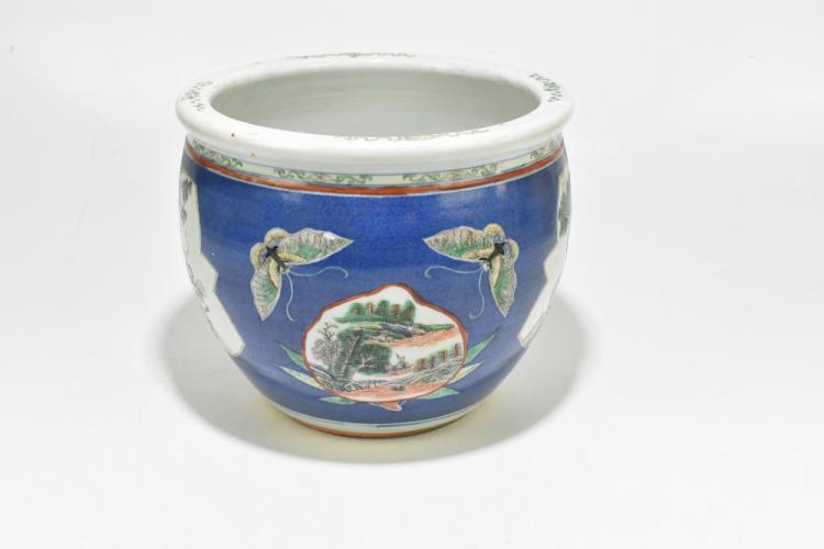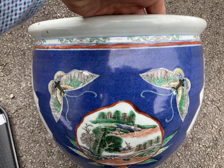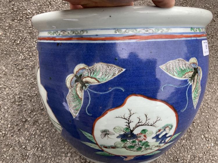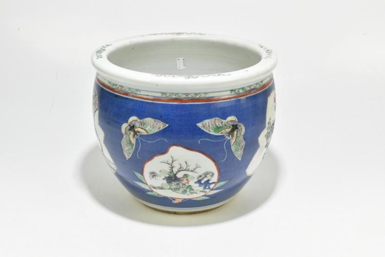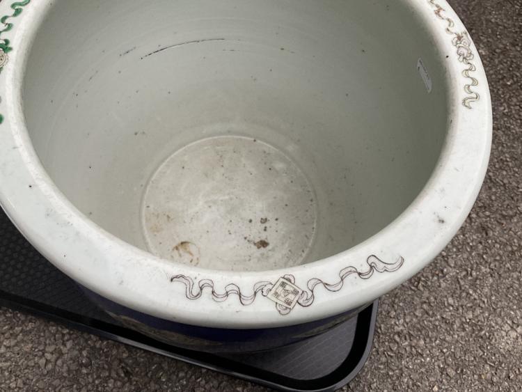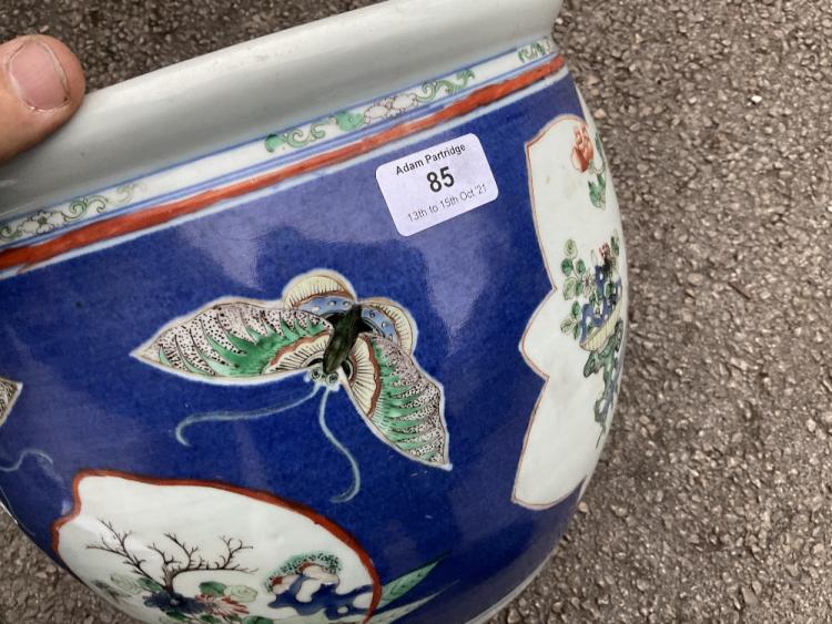 Lot 85 of 1739: A late 19th/early 20th century Chinese famile verte Wucai porcelain jardiniere, decorated with auspicious symbols to rim above butterflies and panels depicting figures and landscapes, height 26cm, diameter 30.5cm.