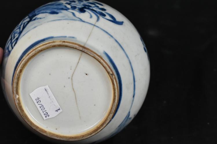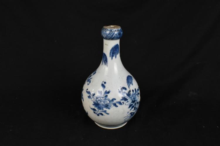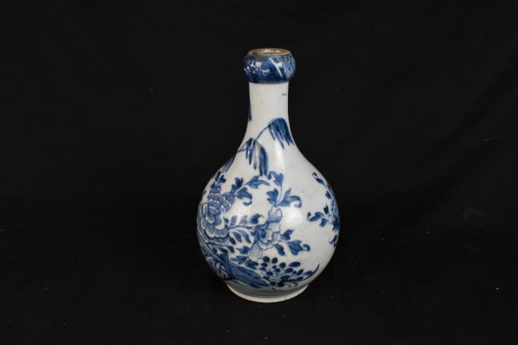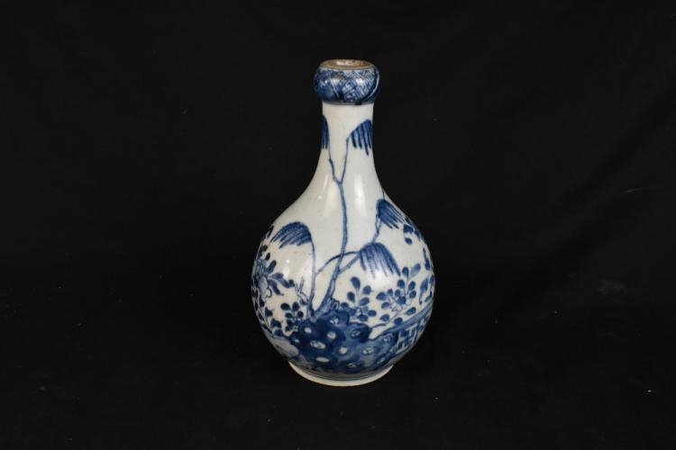 Lot 89 of 1739: An 18th century Chinese blue and white porcelain garlic top vase, decorated with a landscape scene with floral detail, height 21cm.