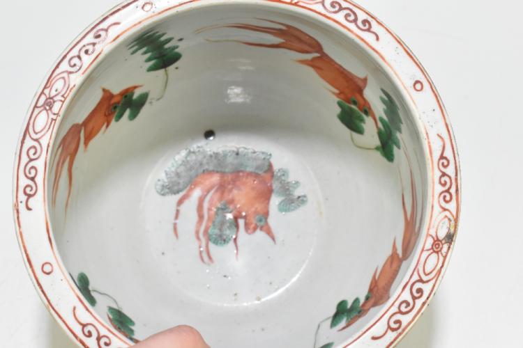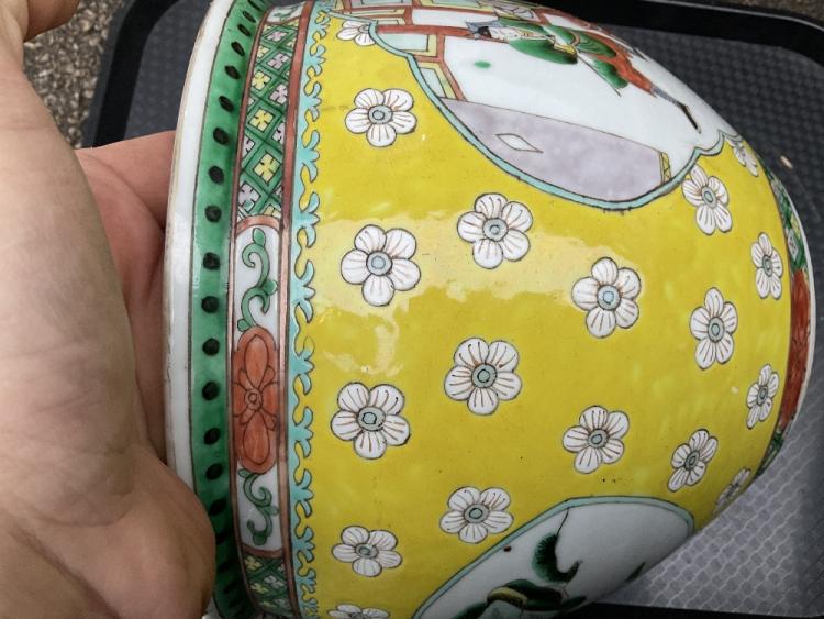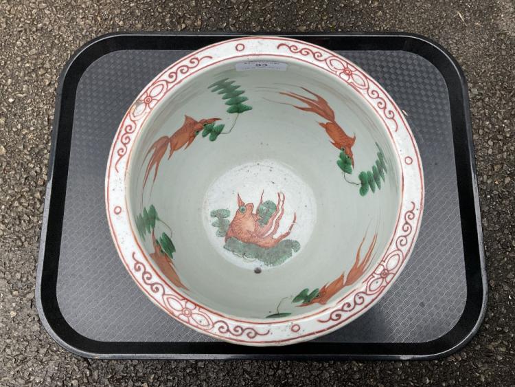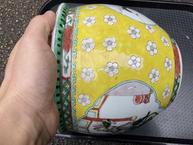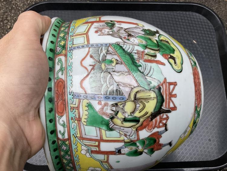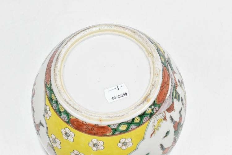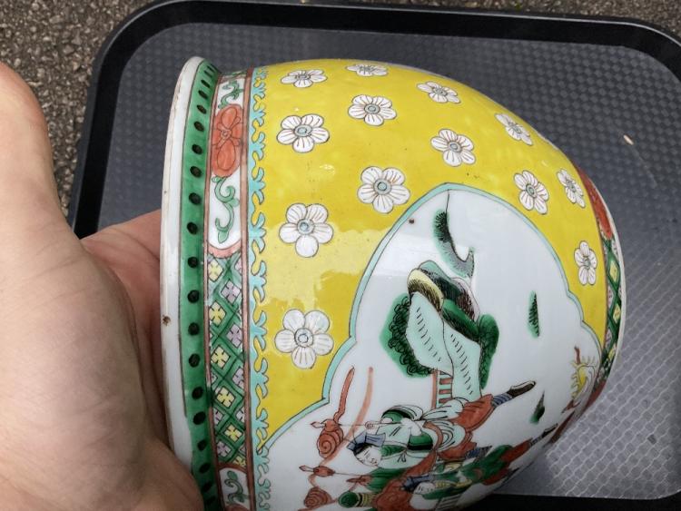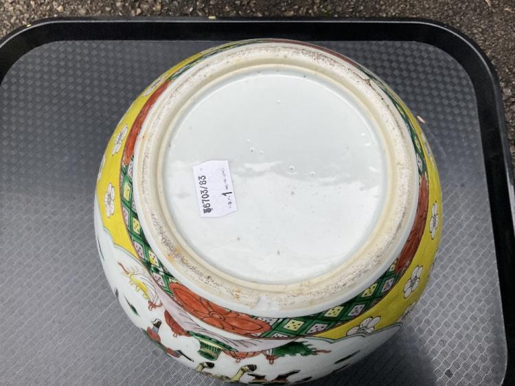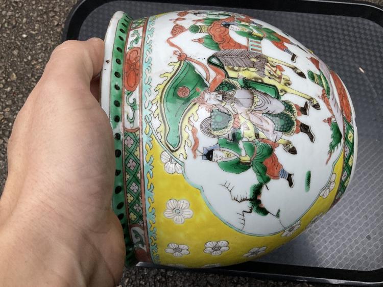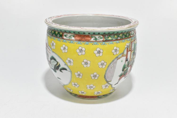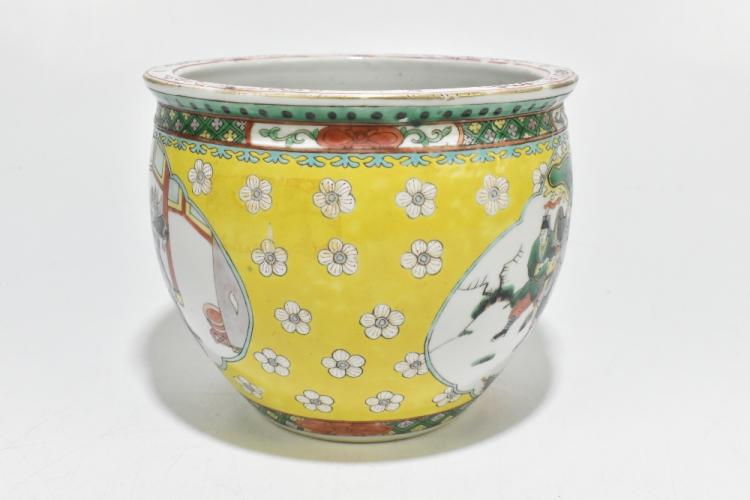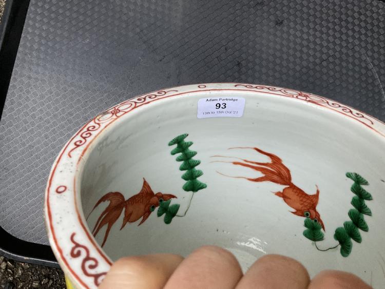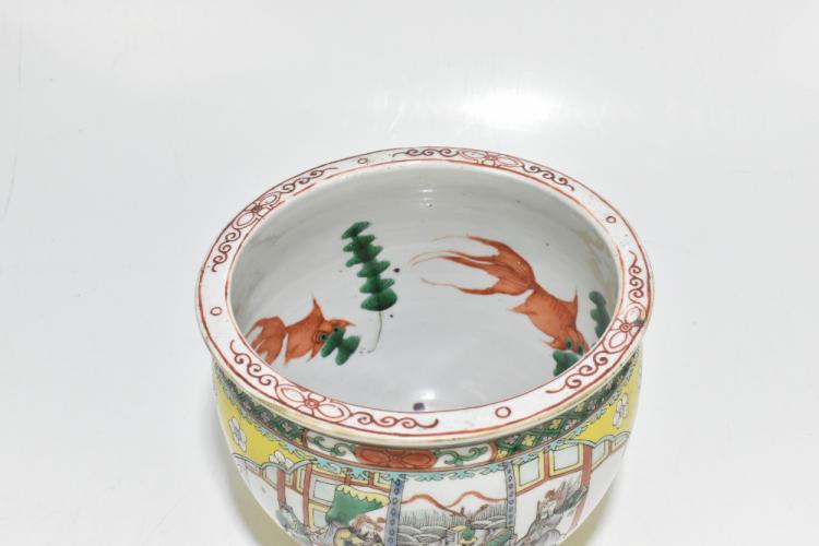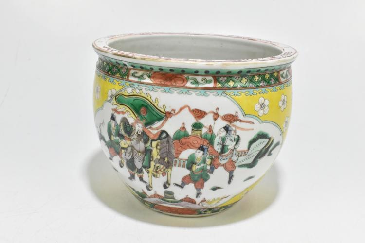 Lot 93 of 1739: A 20th century Chinese famile verte Wucai porcelain jardiniere, decorated with warriors and prunus flowers on a part yellow ground to the exterior and fish to the interior, height 17.5cm, diameter 21cm.