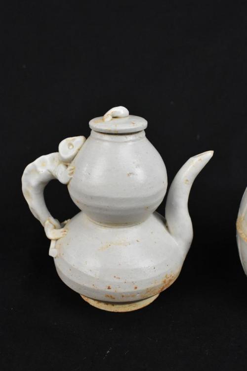 Lot 99 of 1739: ***WITHDRAWN*** A Chinese Blanc de Chine wine ewer with moulded zoomorphic handle, height 12cm and a similarly decorated cylindrical pot and cover, height 8cm (2).