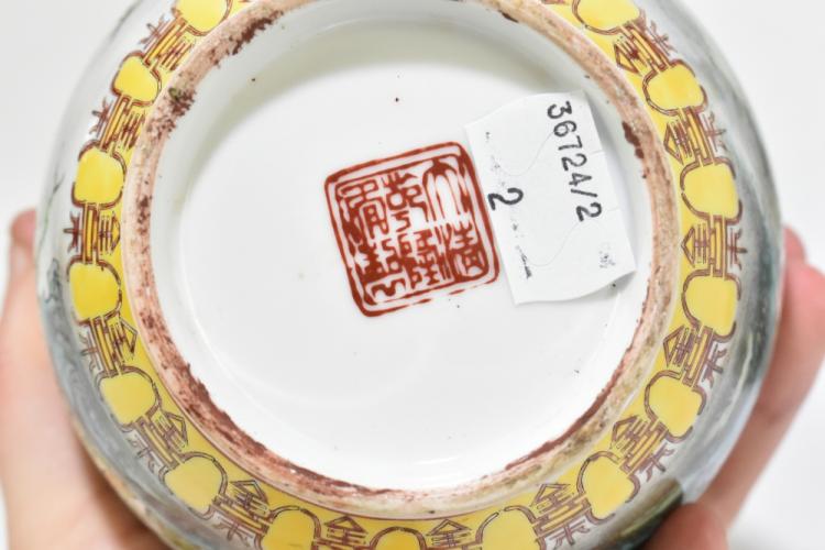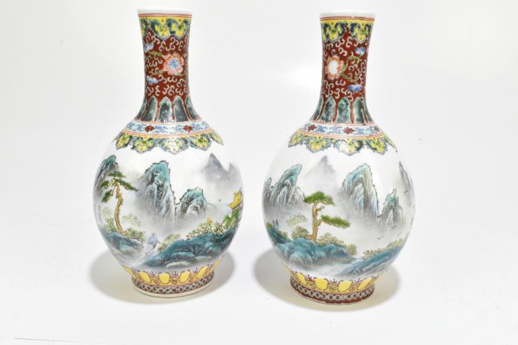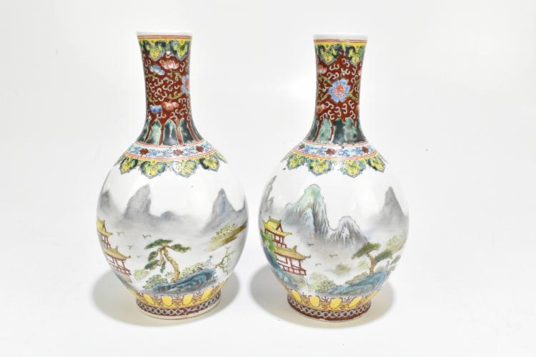 Lot 105 of 1739: A pair of modern Chinese porcelain Famille Verte bottle vases decorated with landscape scenes, bearing printed seal mark to the underside, height 21cm (2).