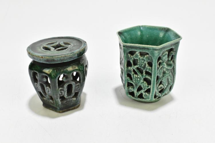 Lot 107 of 1739: A Chinese Famille Verte figure modelled on a stand, 26cm, together with a Chinese pierced and green glazed stand, height 8cm and a reticulated octagonal vase decorated with deities and foliage, height 9cm, with three hardwood stands and a circular hardwood disc (7).