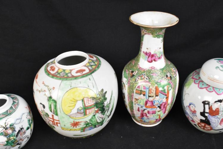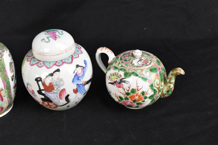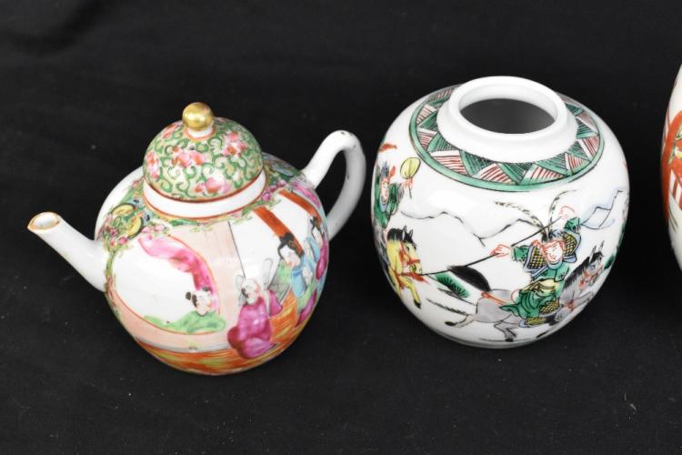 Lot 109 of 1739: A group of early 20th century and later Chinese porcelain including a Canton vase decorated with figures and exotic birds in panels, height 22cm, two similar later teapots, a Chinese Wucai ginger jar decorated with figure on horseback, height 15cm, etc (6).