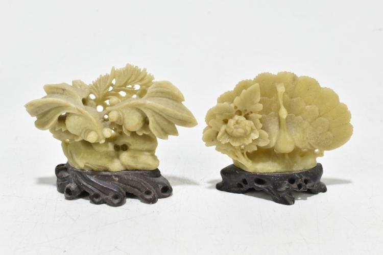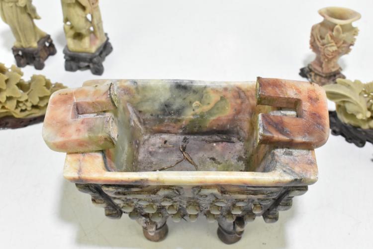 Lot 121 of 1739: A collection of Chinese hardstone items objects including an unusual footed koro with relief decoration, raised on four feet (af), two figures, one representing a wise man, height 16cm, similar carved hardstone fruit sculptures, etc (9).