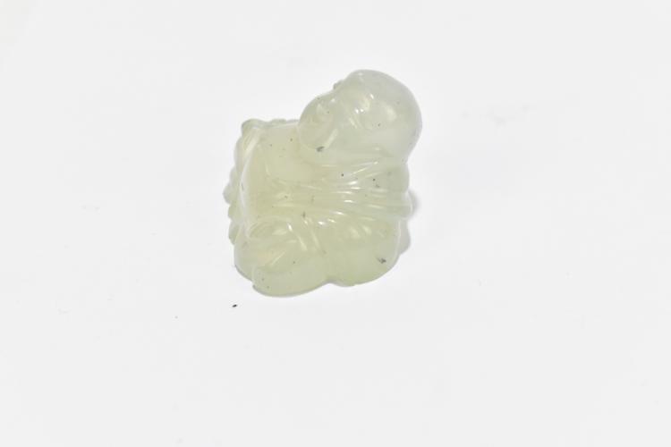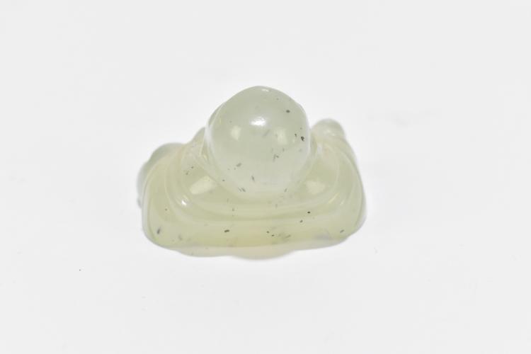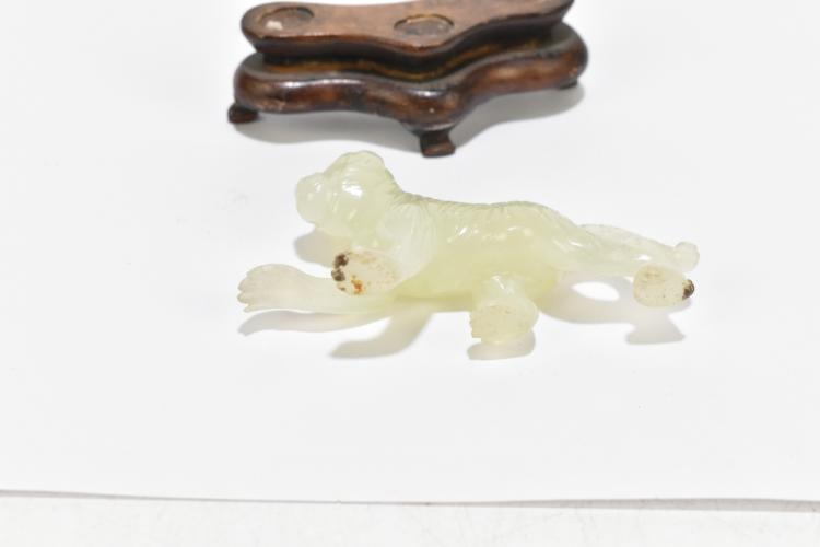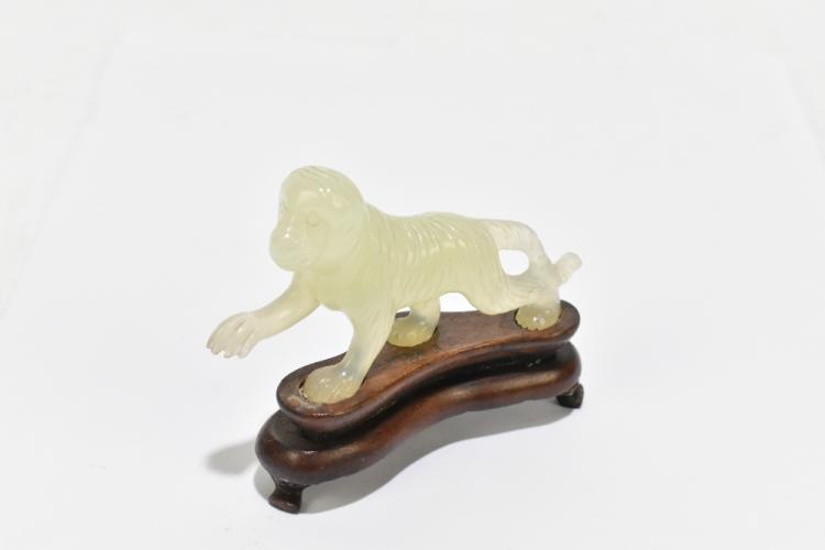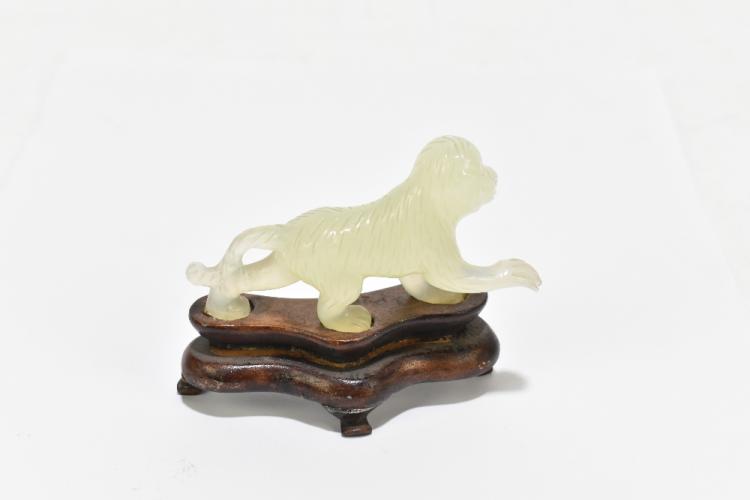 Lot 122 of 1739: A Chinese hardstone footed bowl with mottled detail, diameter 10cm, and three similar hardstone figures including a lion raised on a wooden plinth base and a seated Buddha (4).