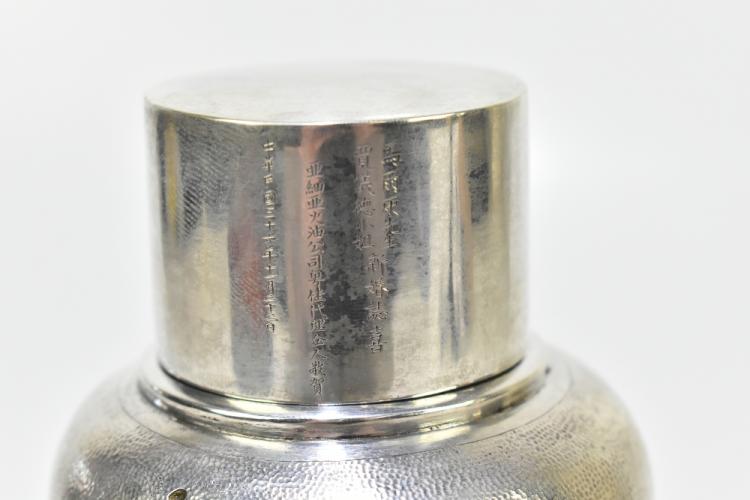 Lot 133 of 1739: A Chinese 90 grade silver Art Deco cocktail shaker with planished decoration to the body, the cover with engraved inscription, impressed mark to the underside, height 24cm.
