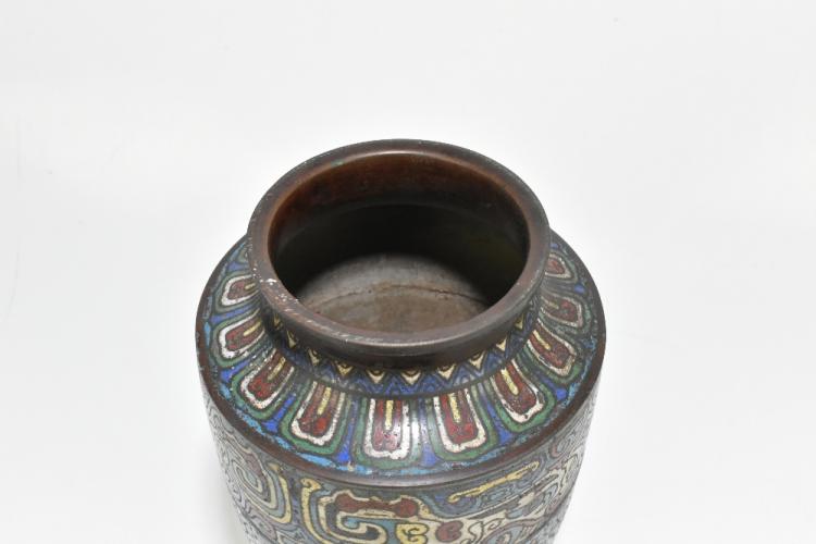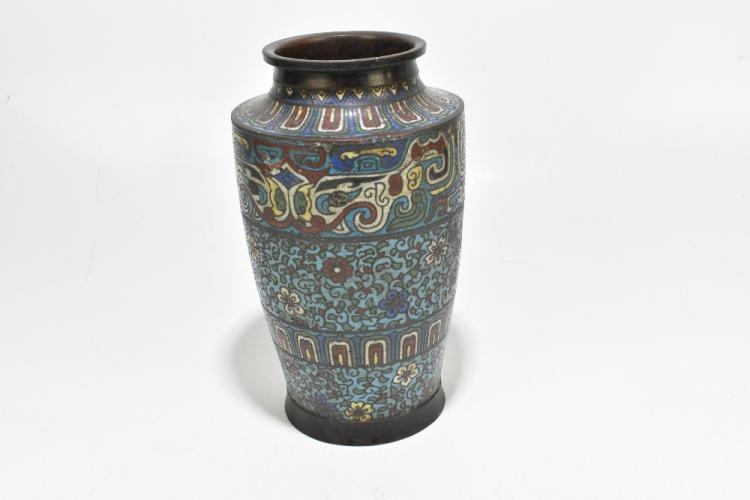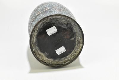 Lot 149 of 1739: An early 20th century Chinese cloisonné vase with inverted shoulder, decorated with auspicious symbols to the top rim above floral detail, embossed indistinct mark to underside, height 30cm.